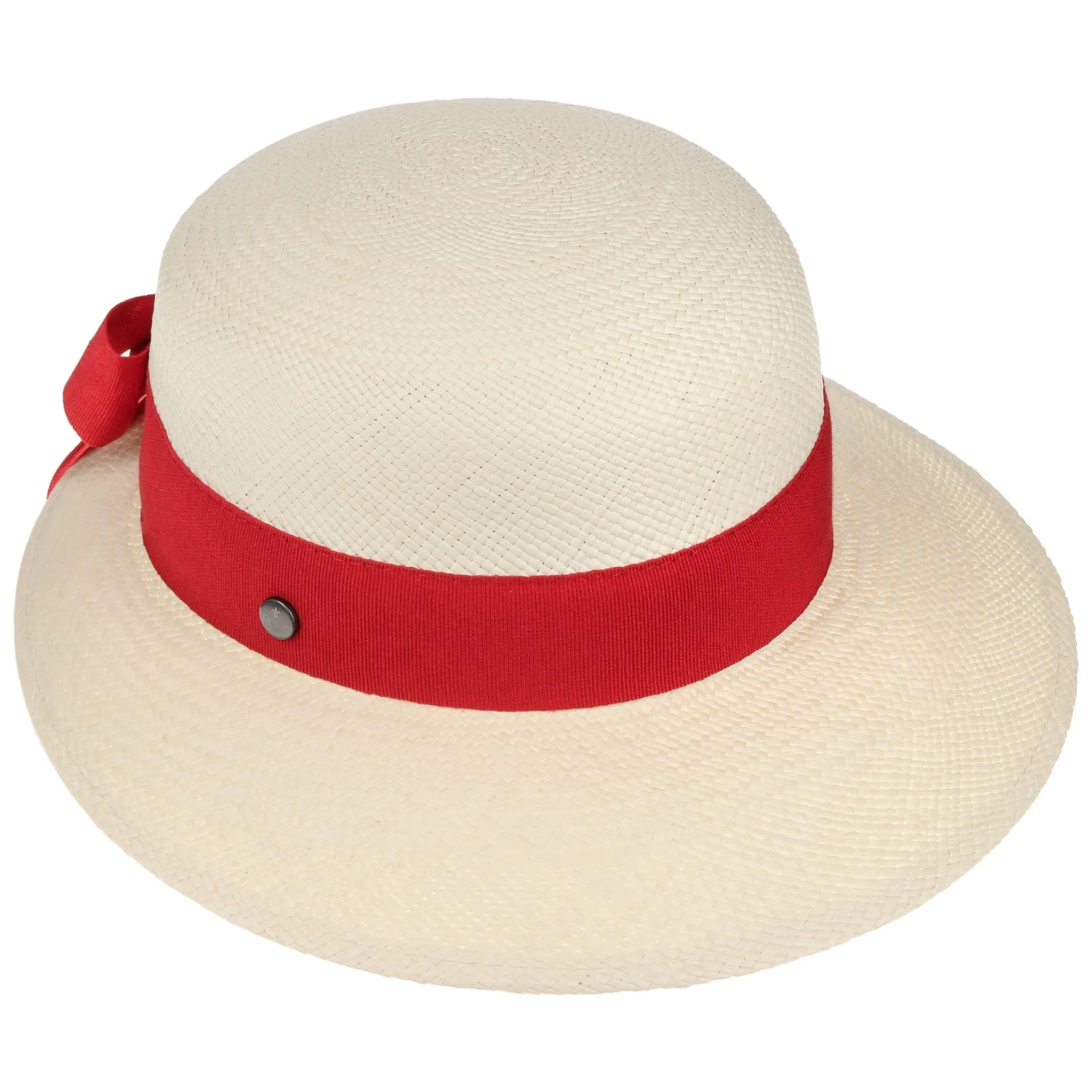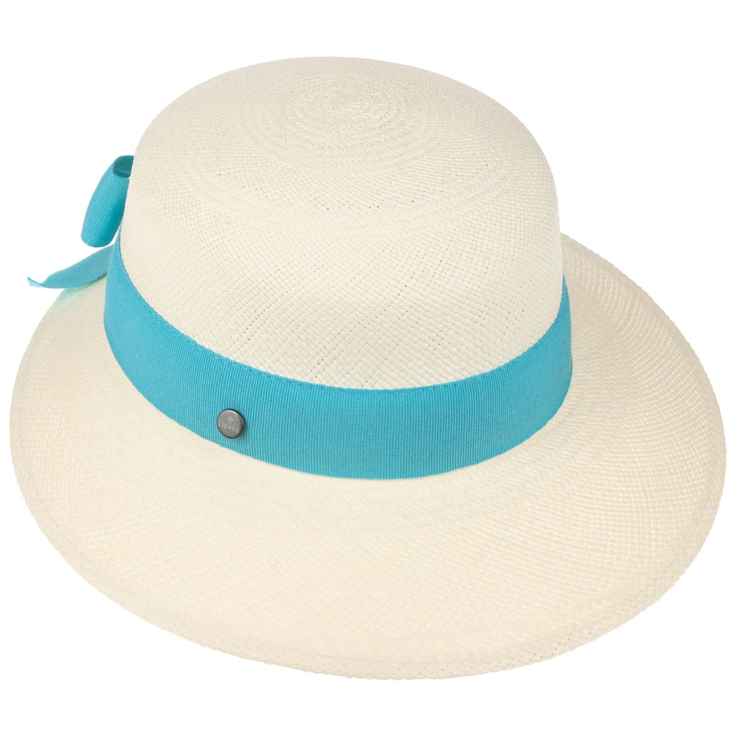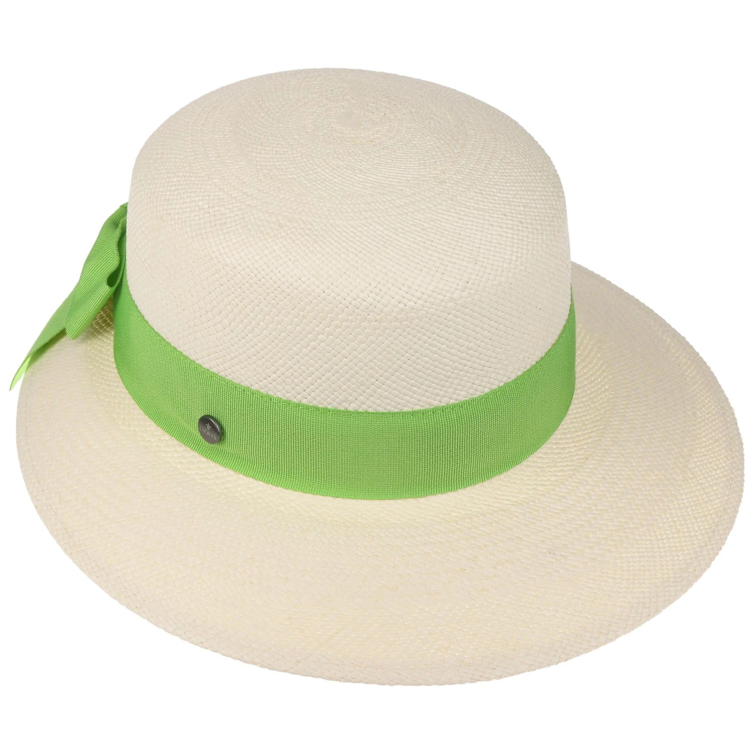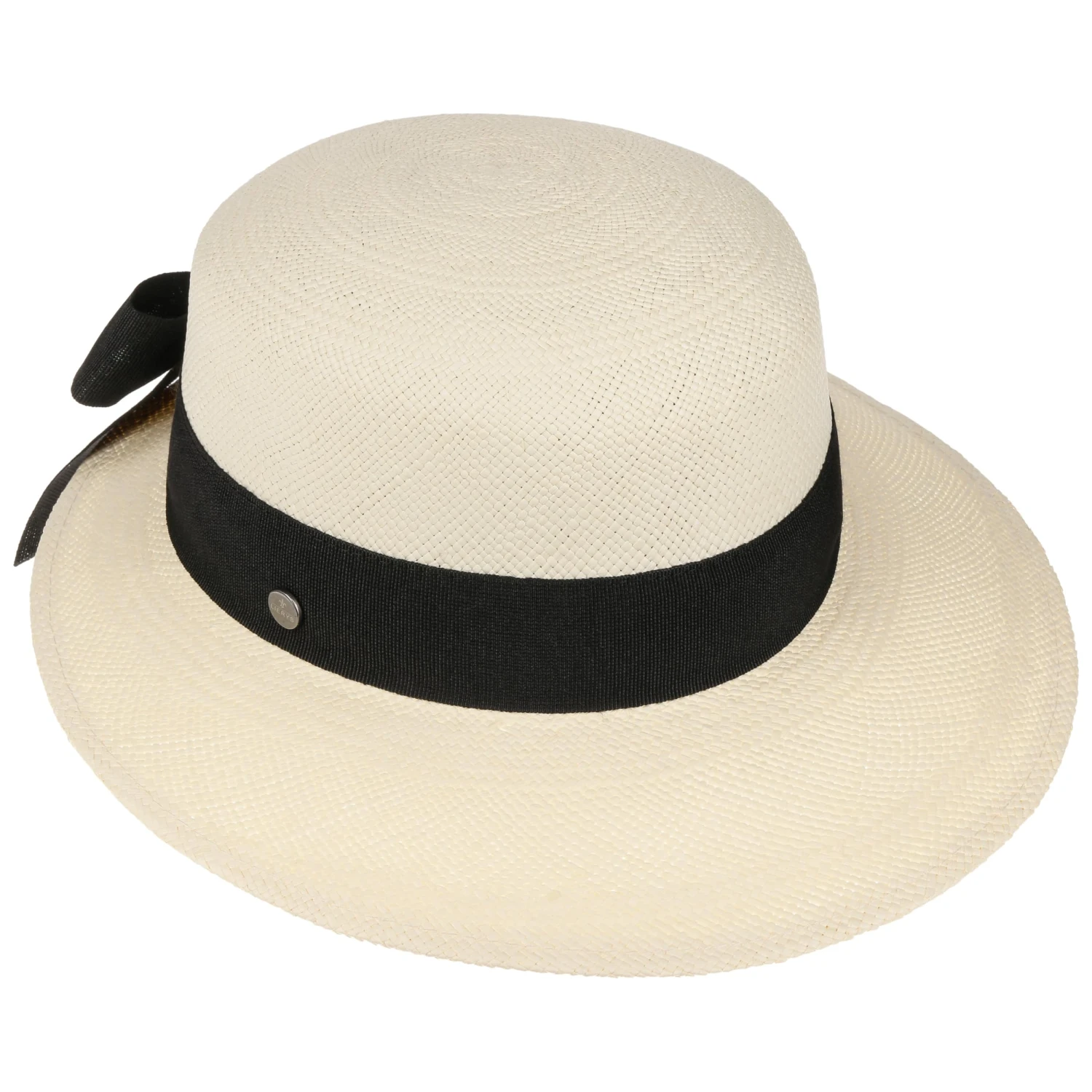 Ihren anmutigen und gleichermaßen unbeschwerten Look verdankt die Kopfbedeckung insbesondere dem in Ecuador in der Brisa-Flechtart handgeflochtenen Panamastroh. Die Form mit der zum Visor verlängerten Krempe bringt Schwung in das Design. Für einen Hauch von Romantik sorgt die rückseitig platzierte Schleife, die das breite farblich abgesetzte Ripsband krönt.