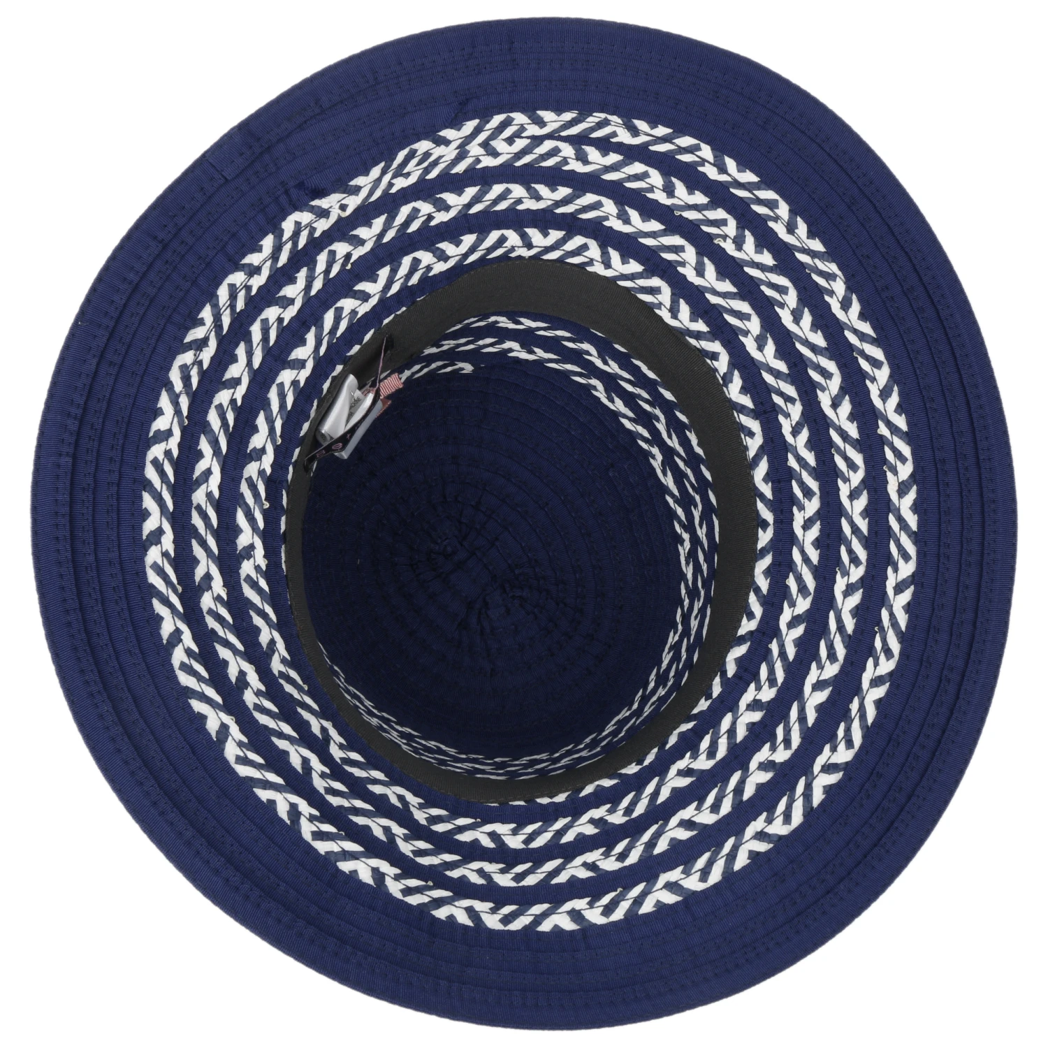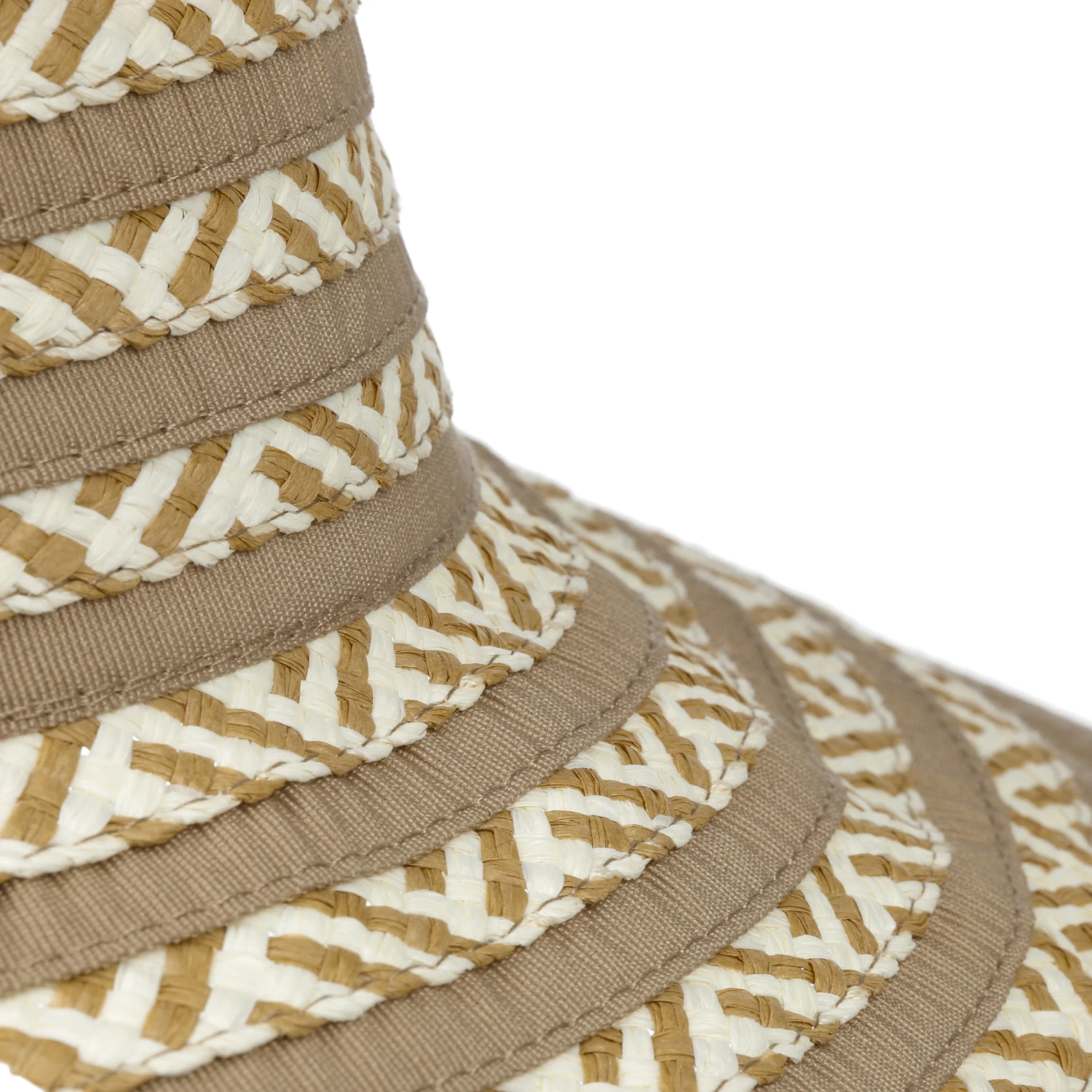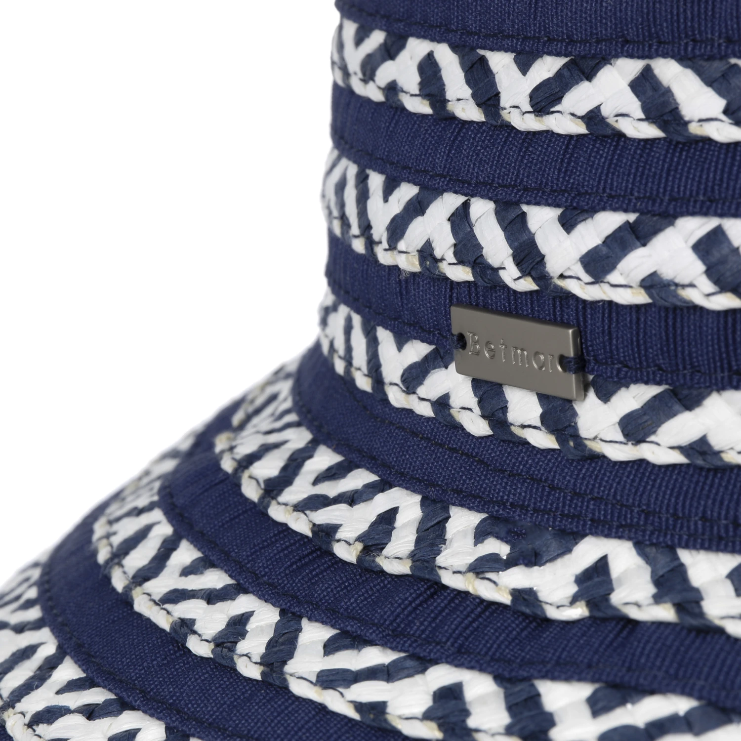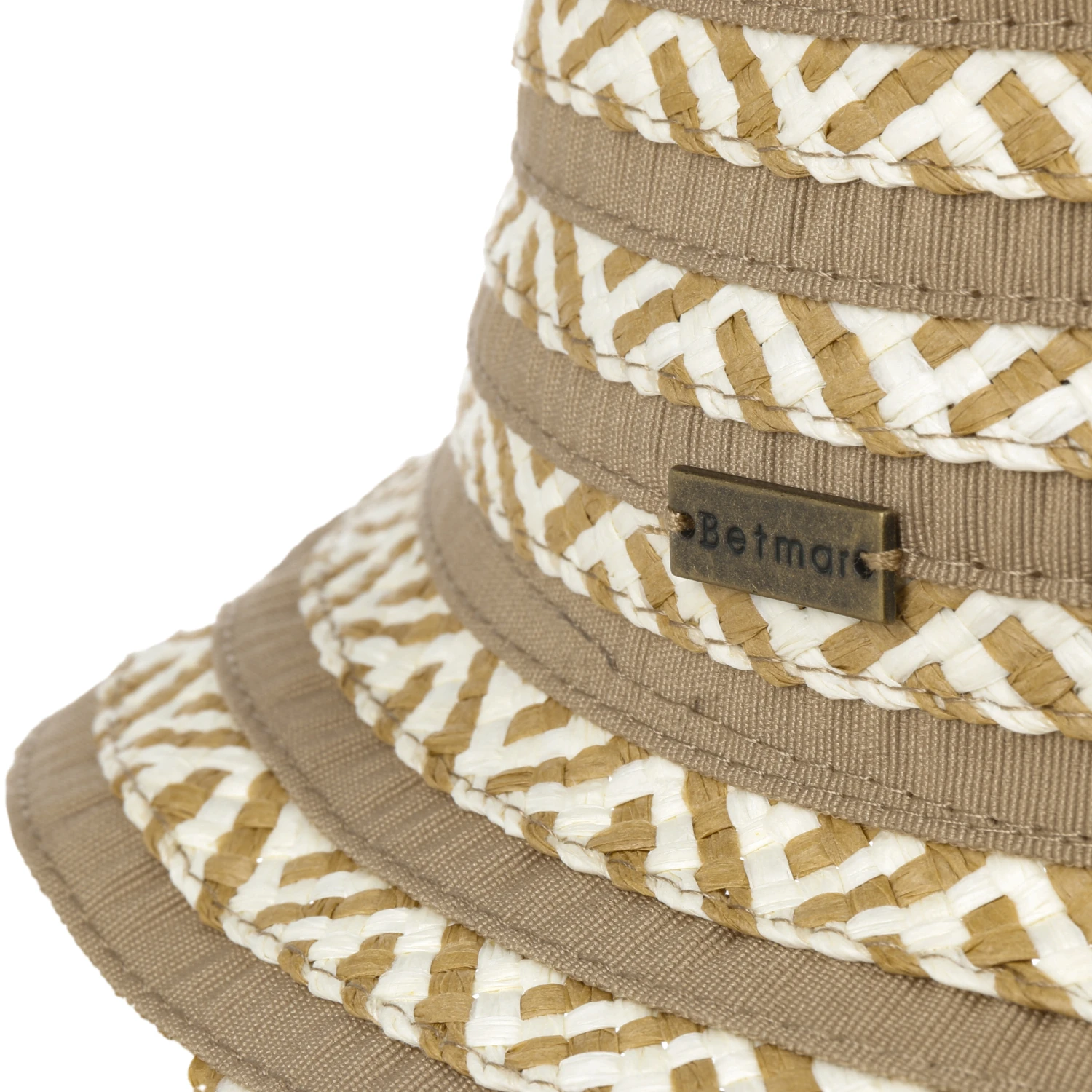 Im Wechsel reihen sich Borten aus Papierstroh und Stoff aneinander, um dem Schlapphut von Betmar seine sommerliche Qualität sowie seinen geschmackvoll wechselnden unifarbenen und gemusterten Look zu bescheren.