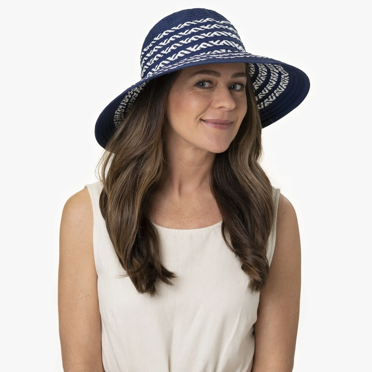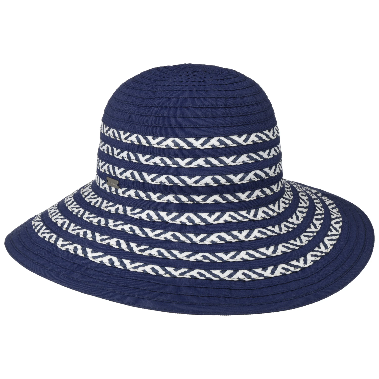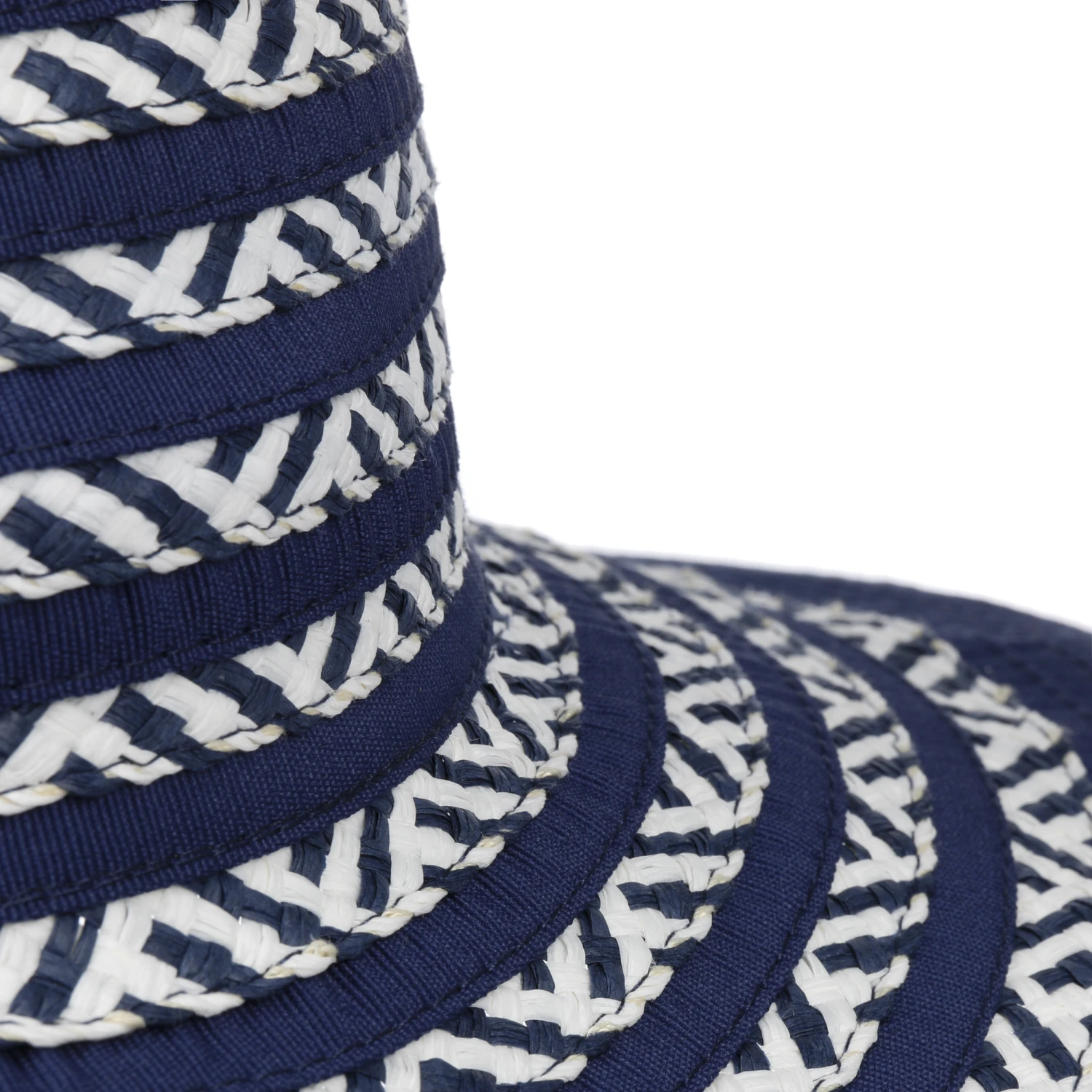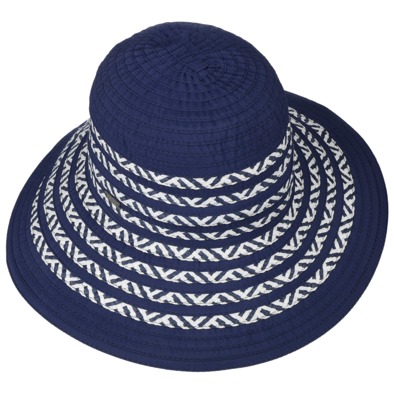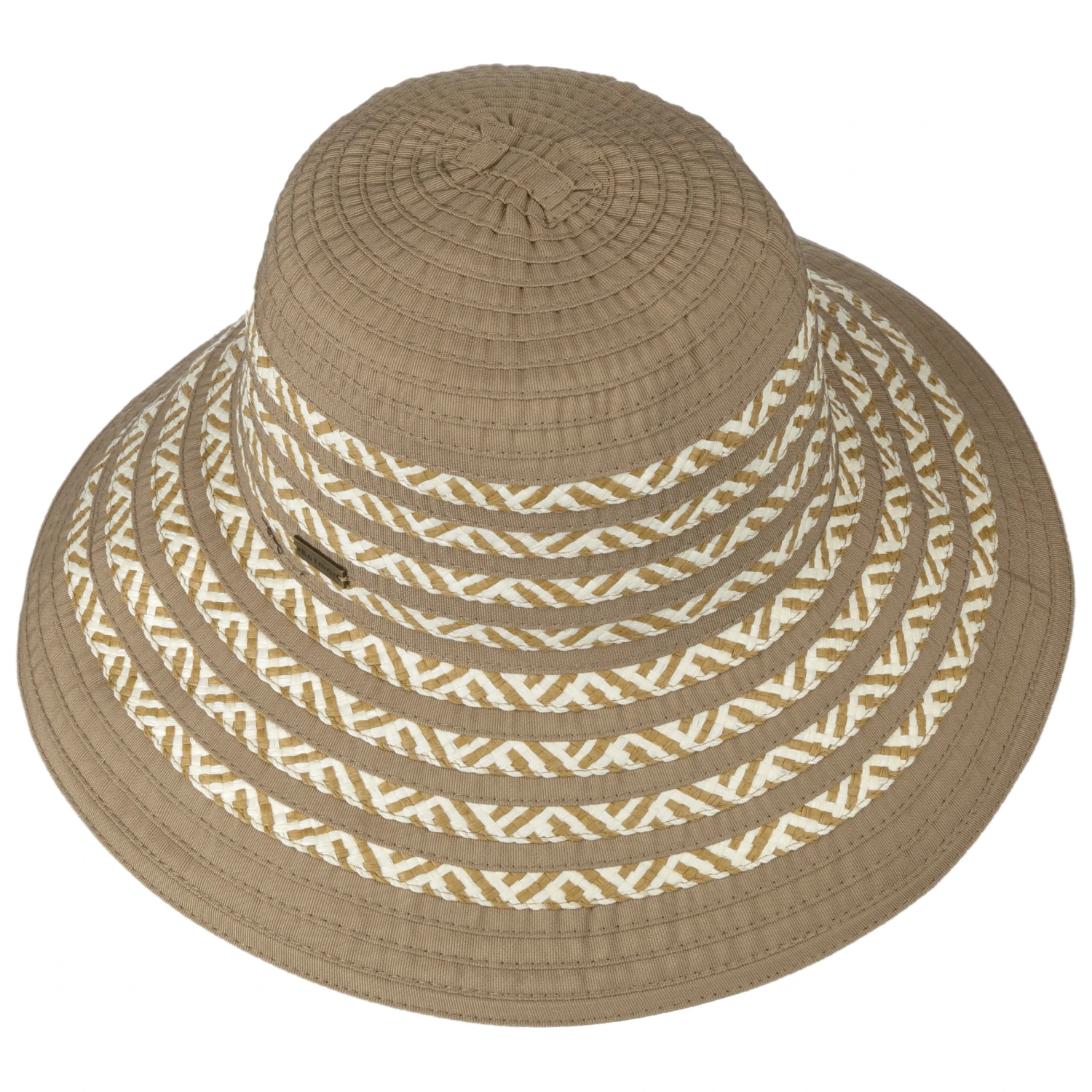 Im Wechsel reihen sich Borten aus Papierstroh und Stoff aneinander, um dem Schlapphut von Betmar seine sommerliche Qualität sowie seinen geschmackvoll wechselnden unifarbenen und gemusterten Look zu bescheren.