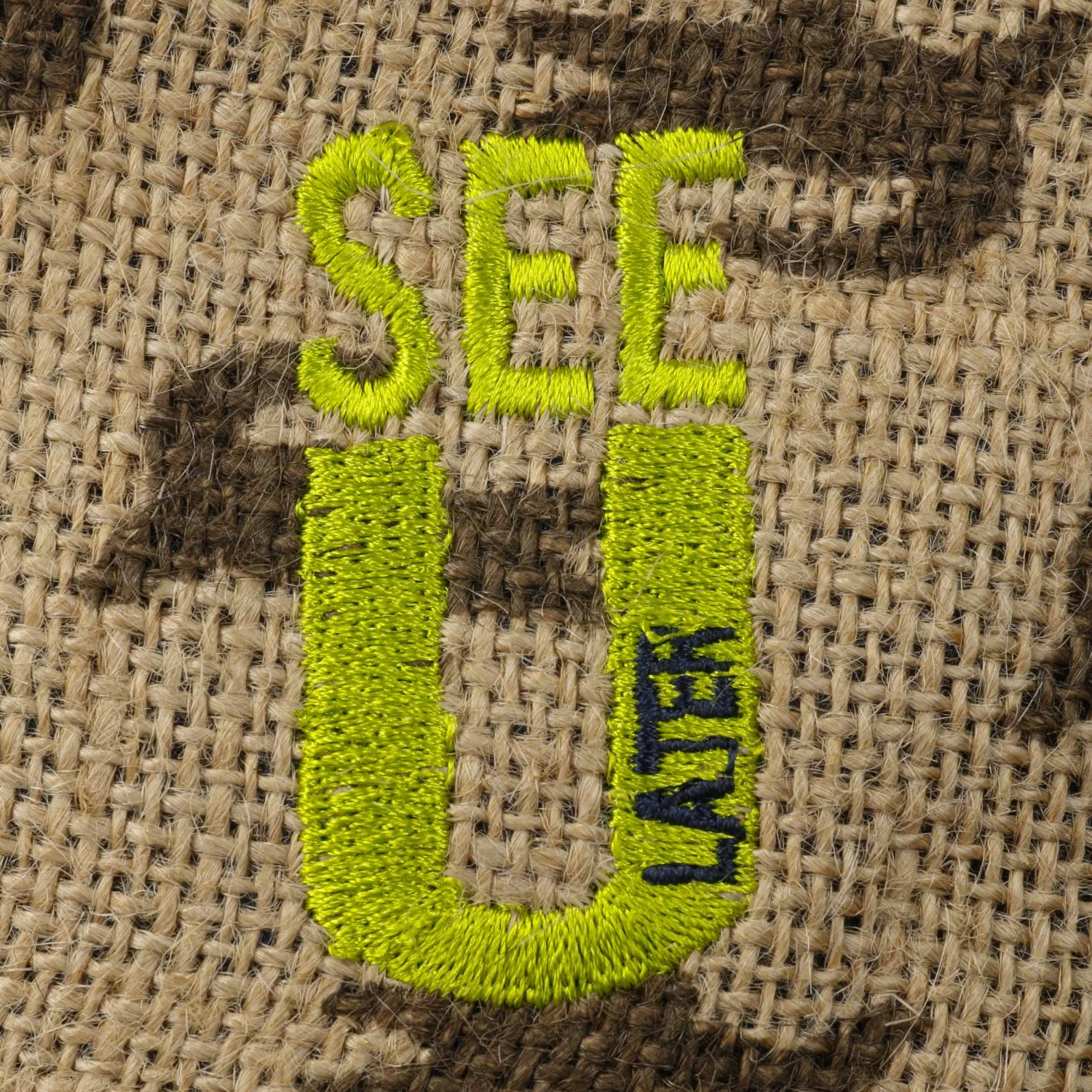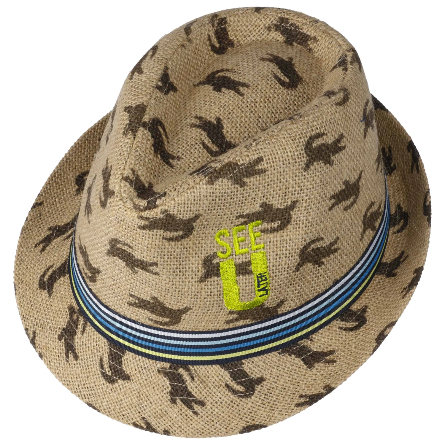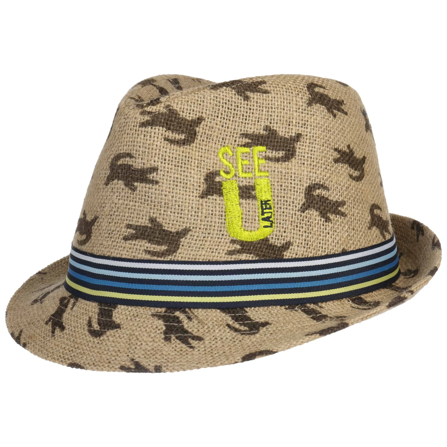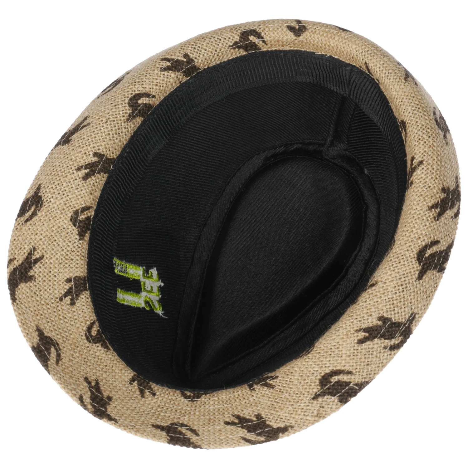 Jute wurde in sommerleichter Qualität zu dem Trilby von Döll geflochten, der seinen großen Vorbildern in nichts nachsteht: Über der hinten kess aufgestellten Krempe umgibt sich der Strohhut ausgelassen mit einer farbig gestreiften Garnitur, er selbst zeigt mit seinen Motiven, wie federleicht er es sich bequem macht.