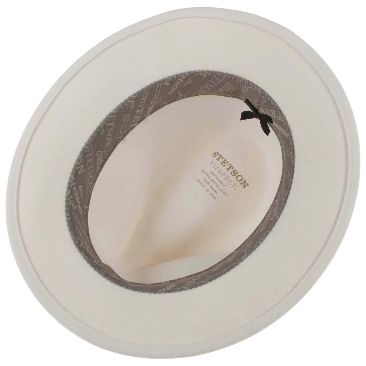 Ein bunt geblümtes Hutband mit kecker Feder hebt sich vom ansonsten einfarbigen Filzhut von Stetson ab.