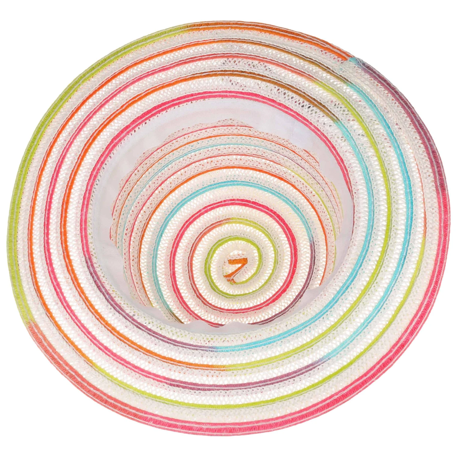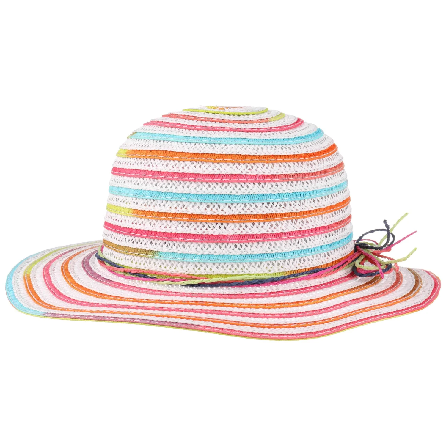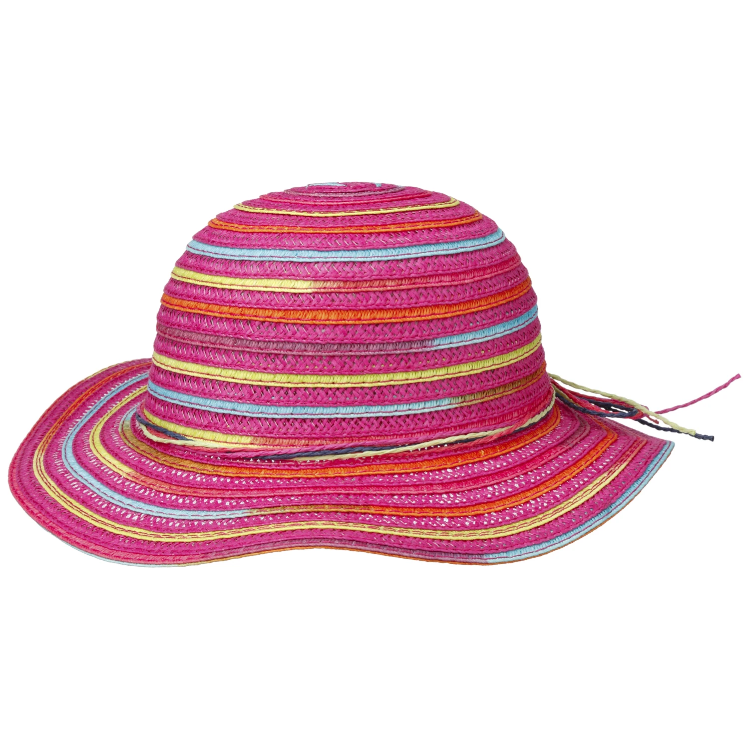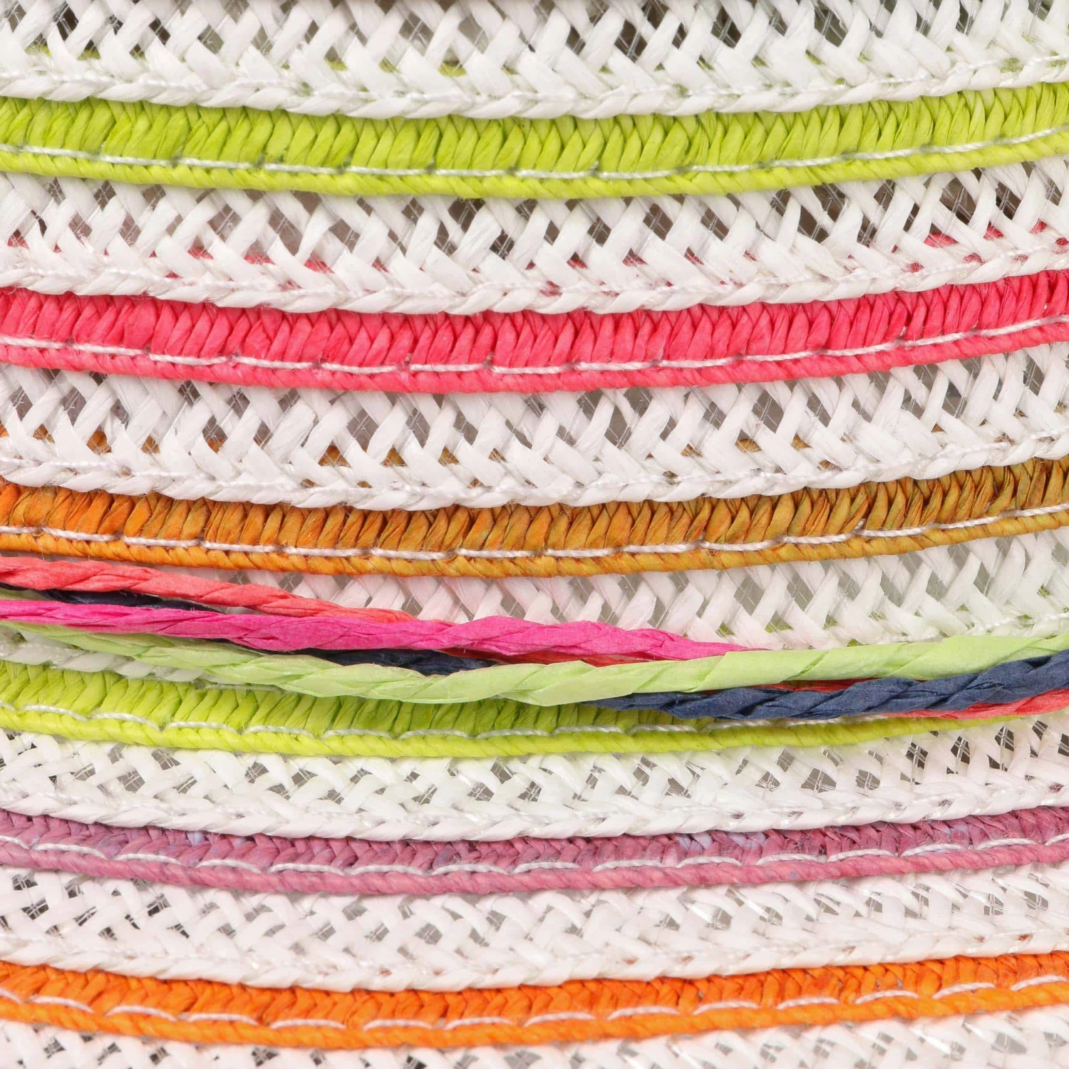Der Kopf und die breite, vor UV-Strahlung schützende Krempe sind mit kunterbunten Streifen verziert. Sie sorgen für eine dynamische, fröhlich anmutende Optik, die jedes Freizeit-Outfit mit verspieltem Charme bereichert. Ein Garniturband mit Schleife rundet das hübsche Design ab.