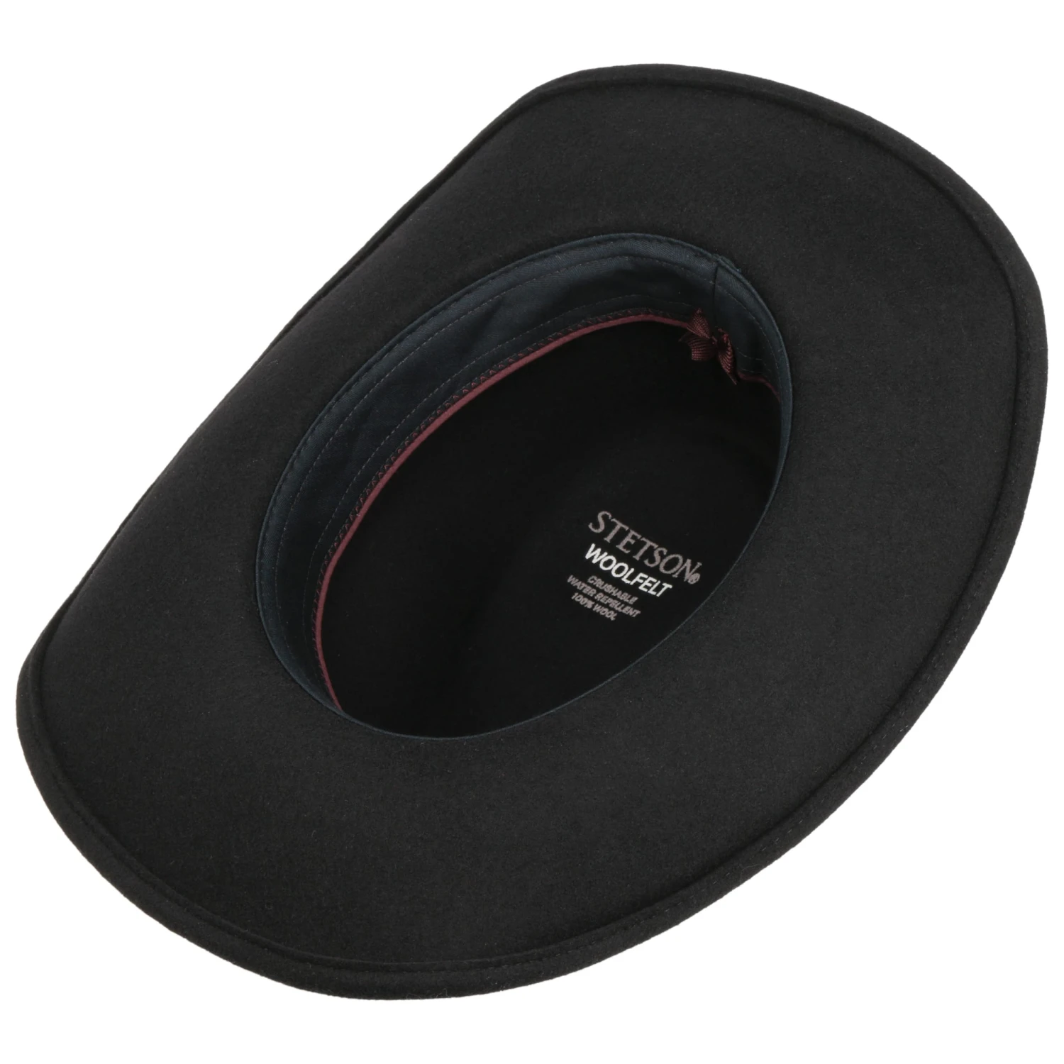 Eine ausgefallen geschnittene Hutgarnitur mit kreuzförmigen Metallverzierungen setzt ihr modisches Abzeichen auf den rustikalen Westernhut von Stetson USA.