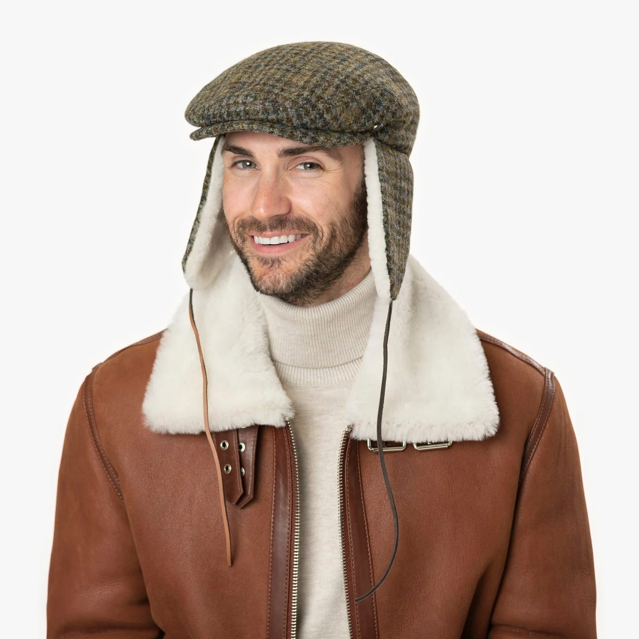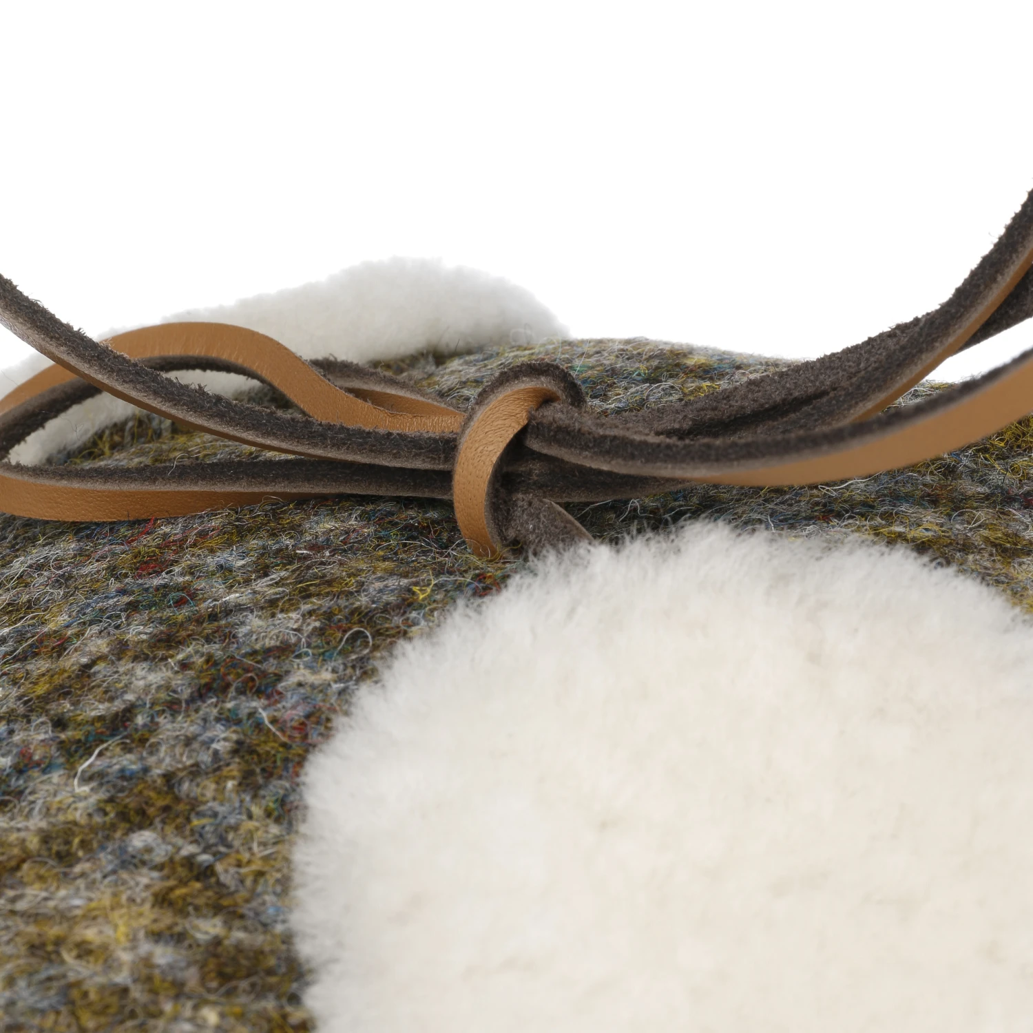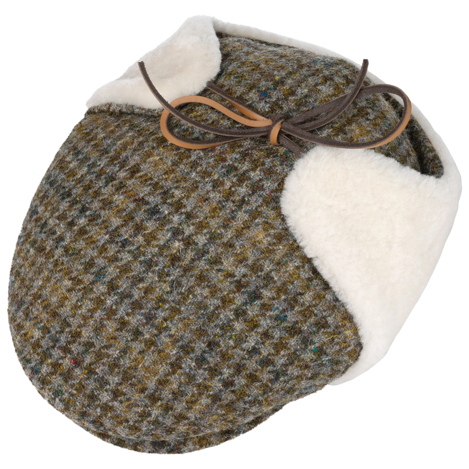 Bei milderen Temperaturen lassen sie sich hochklappen und über dem Kopf zusammenbinden. Das verleiht der zweiteiligen Schiebermütze aus Harris Tweed mit zeitlosem Allover-Muster einen kecken Look.
