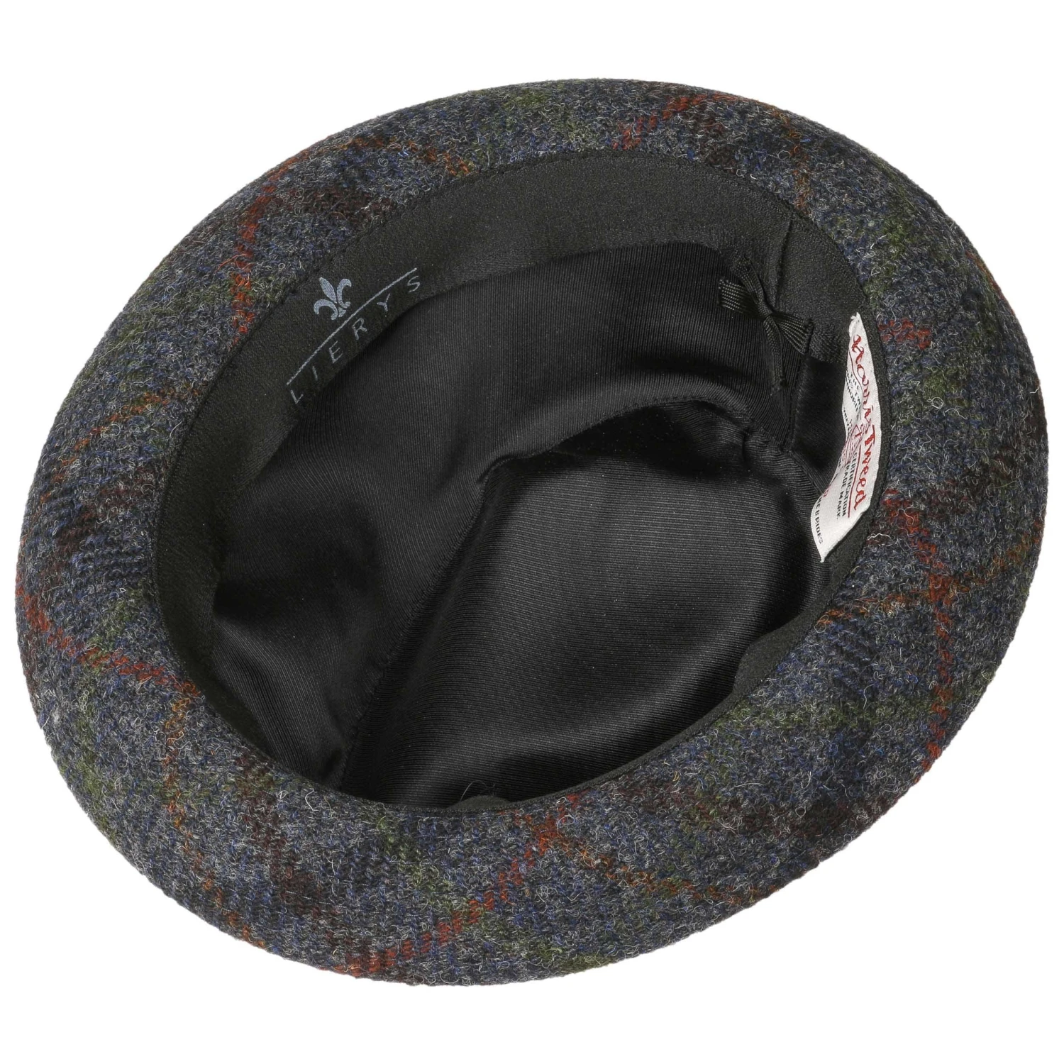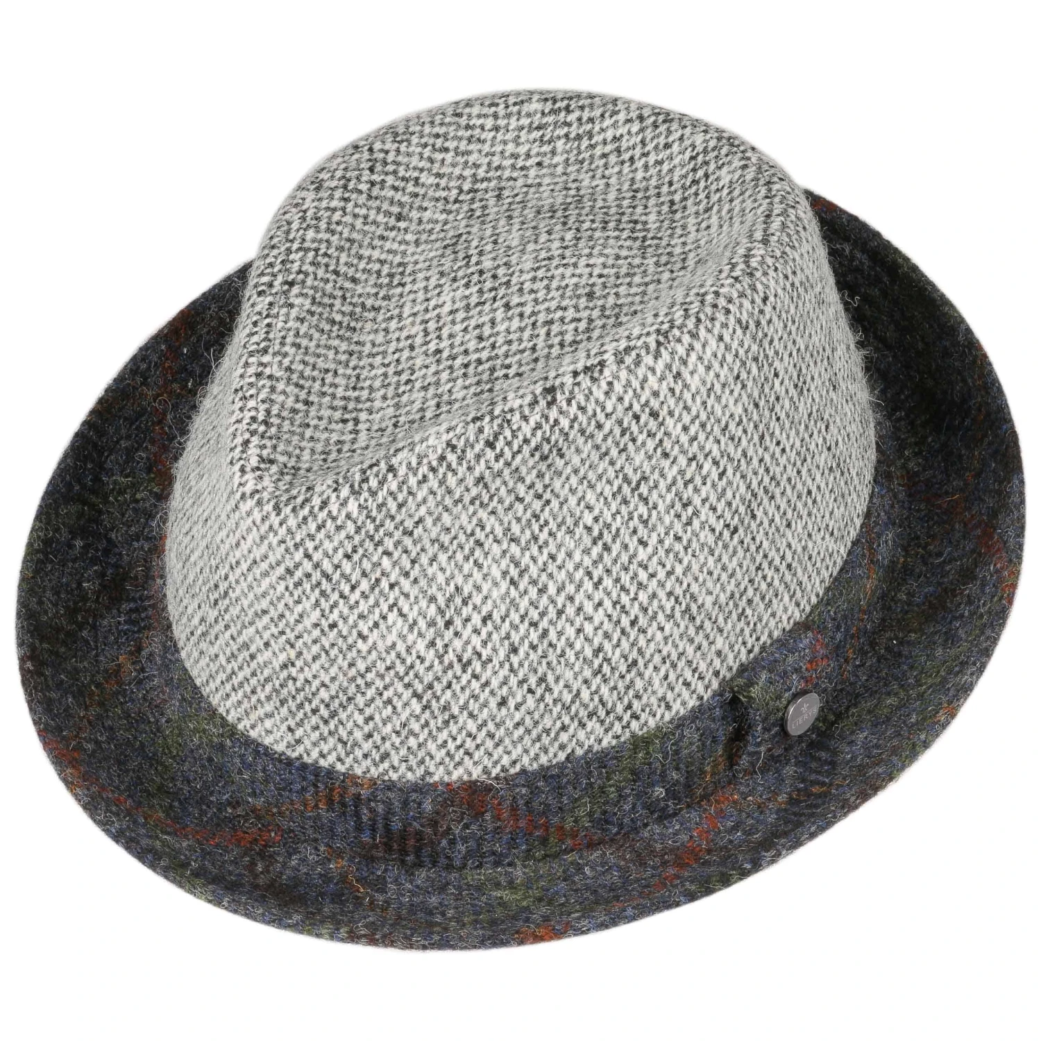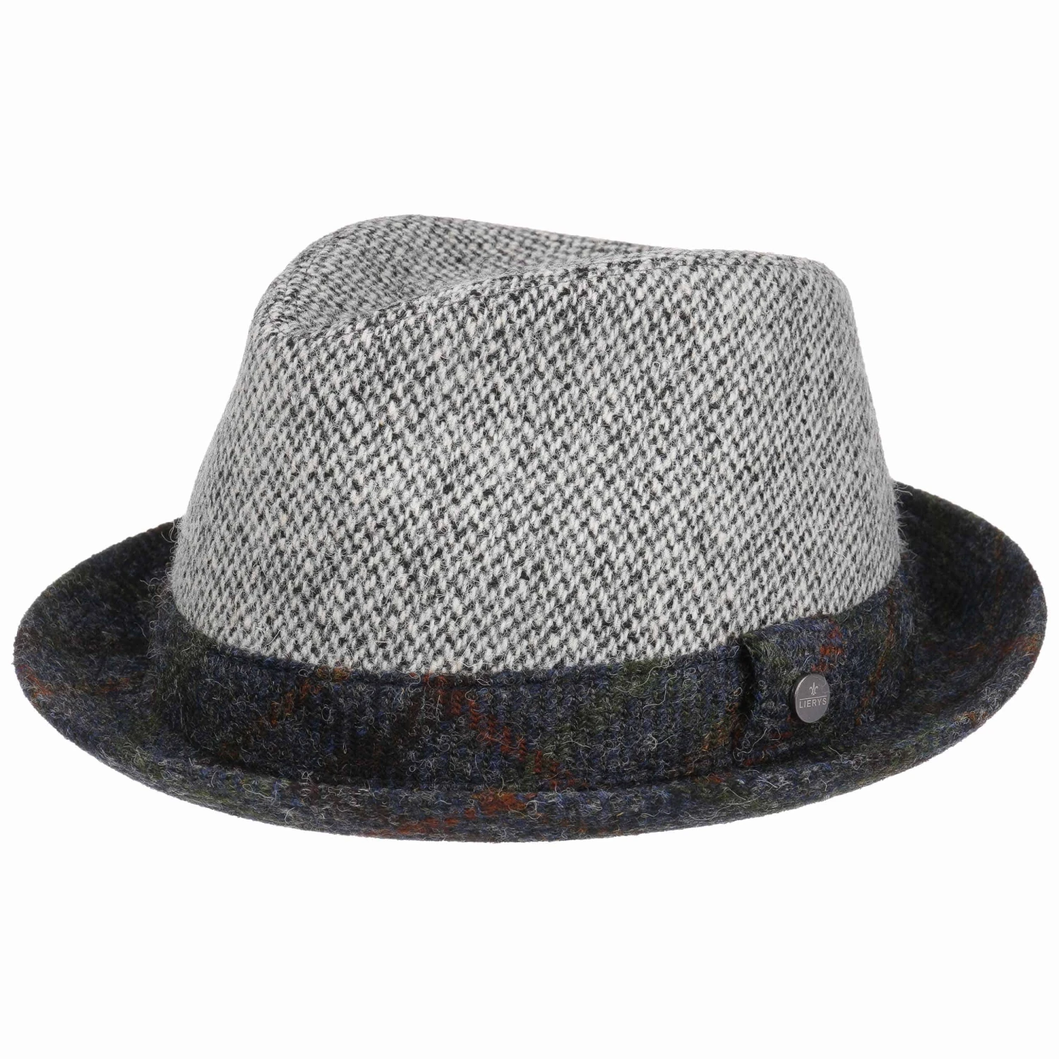 Wolle in Harris-Tweed-Qualität formt sich zu dem Pork Pie mit seitlichem Markenpin von Lierys.