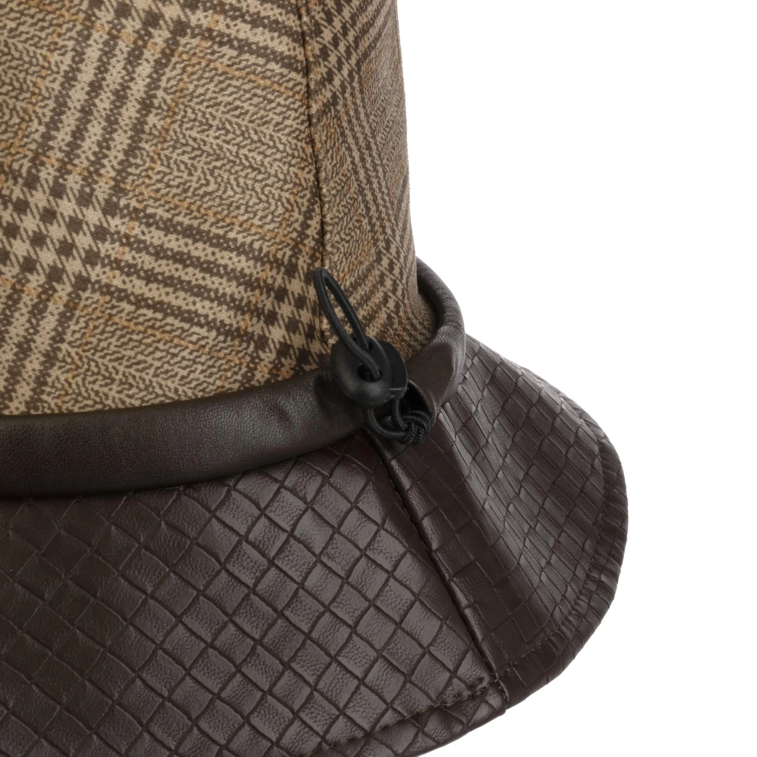 Er verfügt über eine markant strukturierte unifarbene Krempe in Lederoptik. Diese bildet einen attraktiven Kontrast zum Obermaterial des Bucket Hats mit klassischem Hahnentrittmuster. Ein ähnlich gemustertes Garniturband verbindet Krone und Hutkrempe miteinander. Das weiche Fleecefutter macht die modische Kopfbedeckung zum idealen Accessoire für Herbst und Winter.
