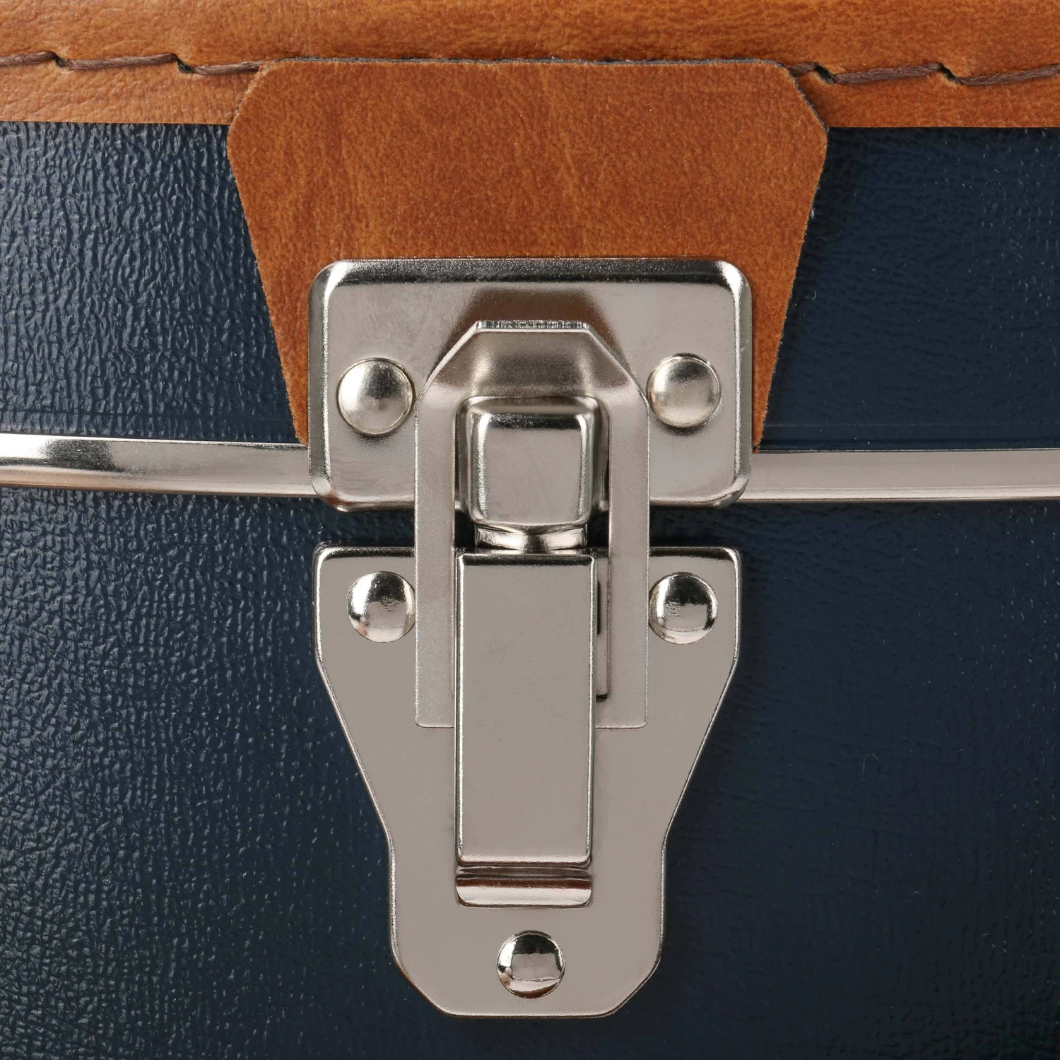 Hier ist er in stabiler, mit Kunstleder überzogener Pappe sicher verwahrt. Der Deckel ist per Schnappverschluss gesichert, dank Tragegriff kann die Hutbox bequem transportiert werden. Die Kopfbedeckung vertreibt sich unterdessen die Zeit, indem sie das schicke Muster im Inneren betrachtet.