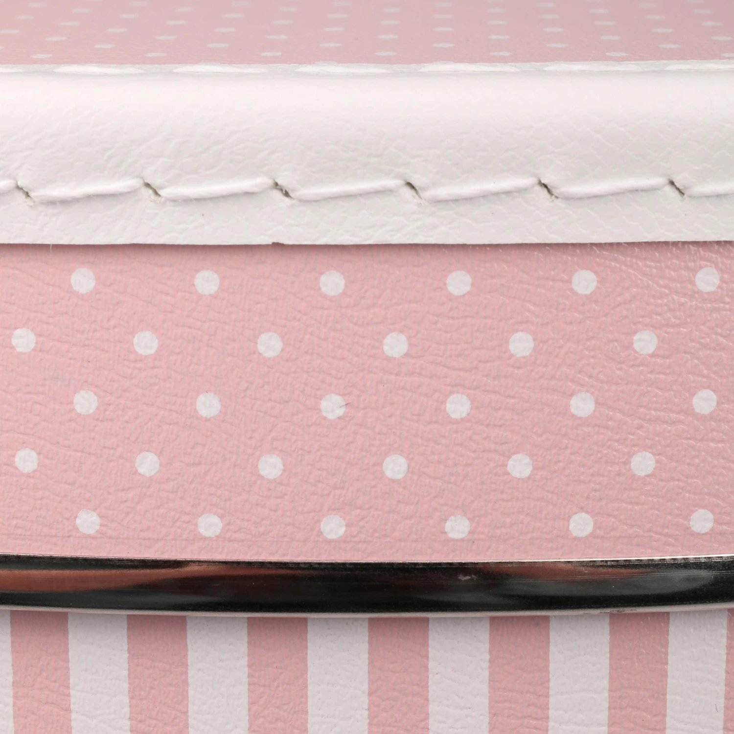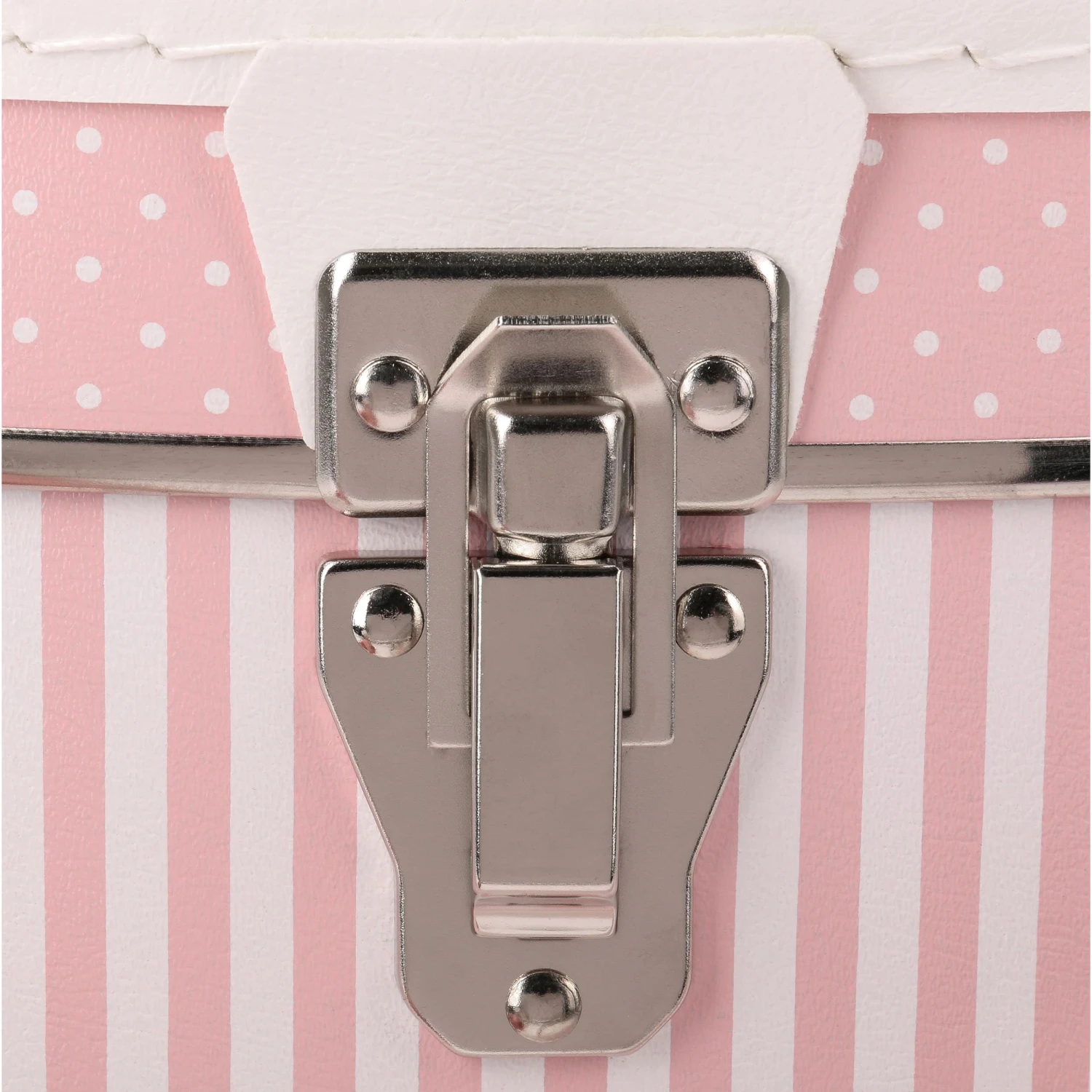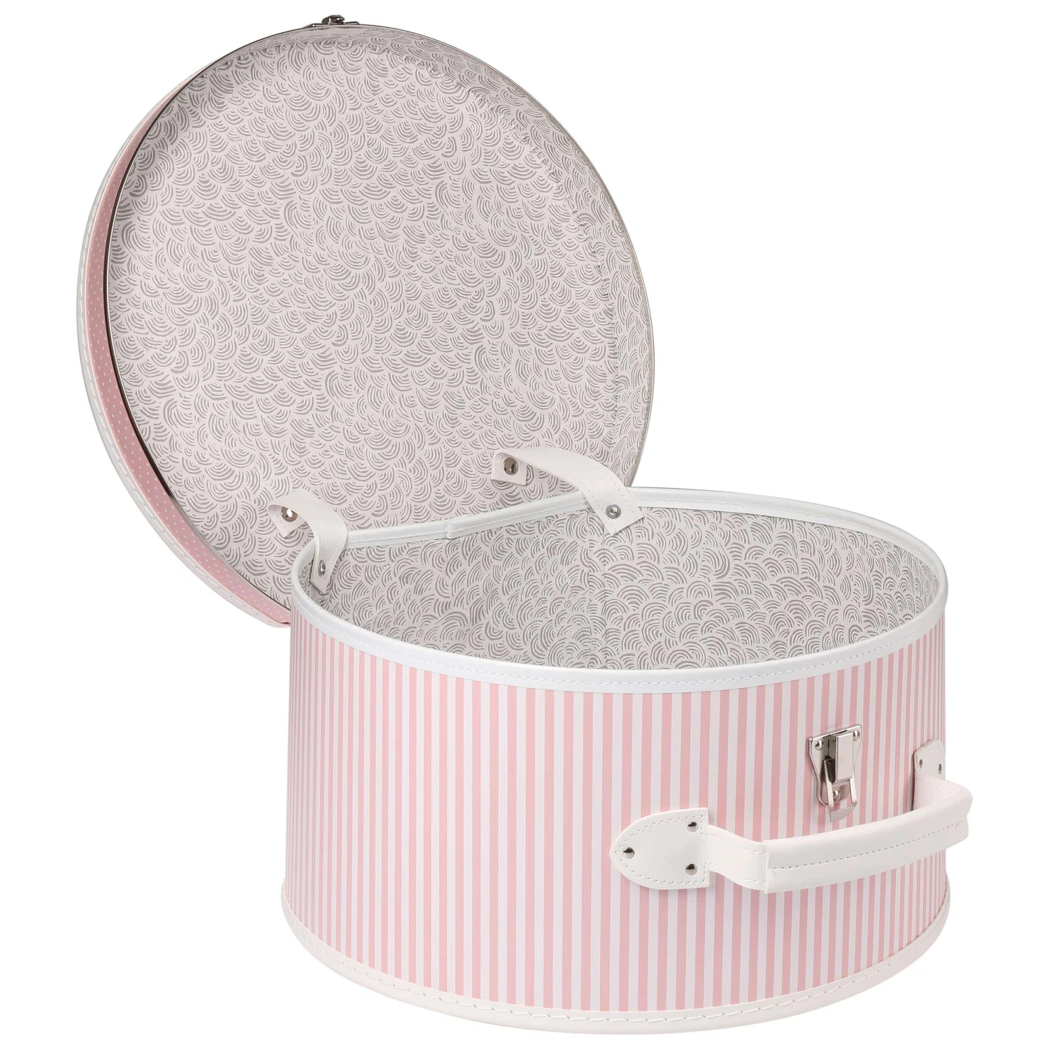 Diese robuste Hutbox mit einem in weiß gehaltenen Tragegriff besticht durch einen süßen, in rosa Streifen gehaltenen Look.