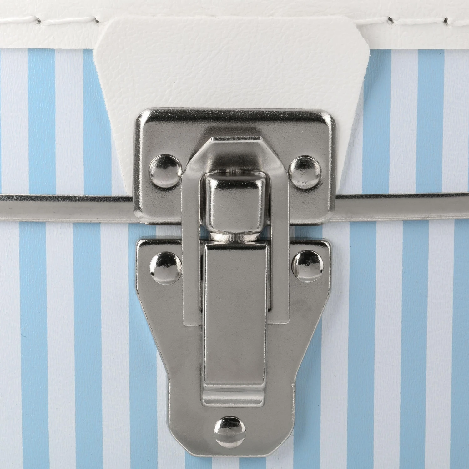 Dieser robuste Hutkoffer mit einem in weiß gehaltenen Tragegriff besticht durch einen eleganten, in blau-weißen Streifen gehaltenen Look.
