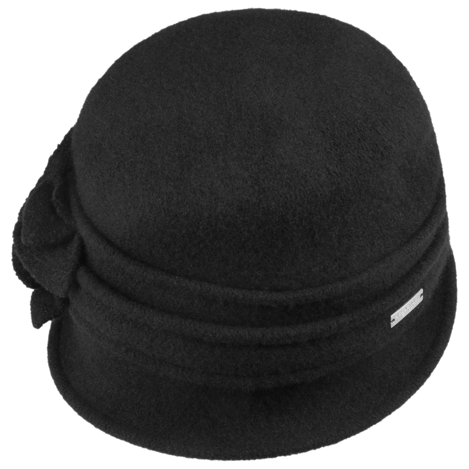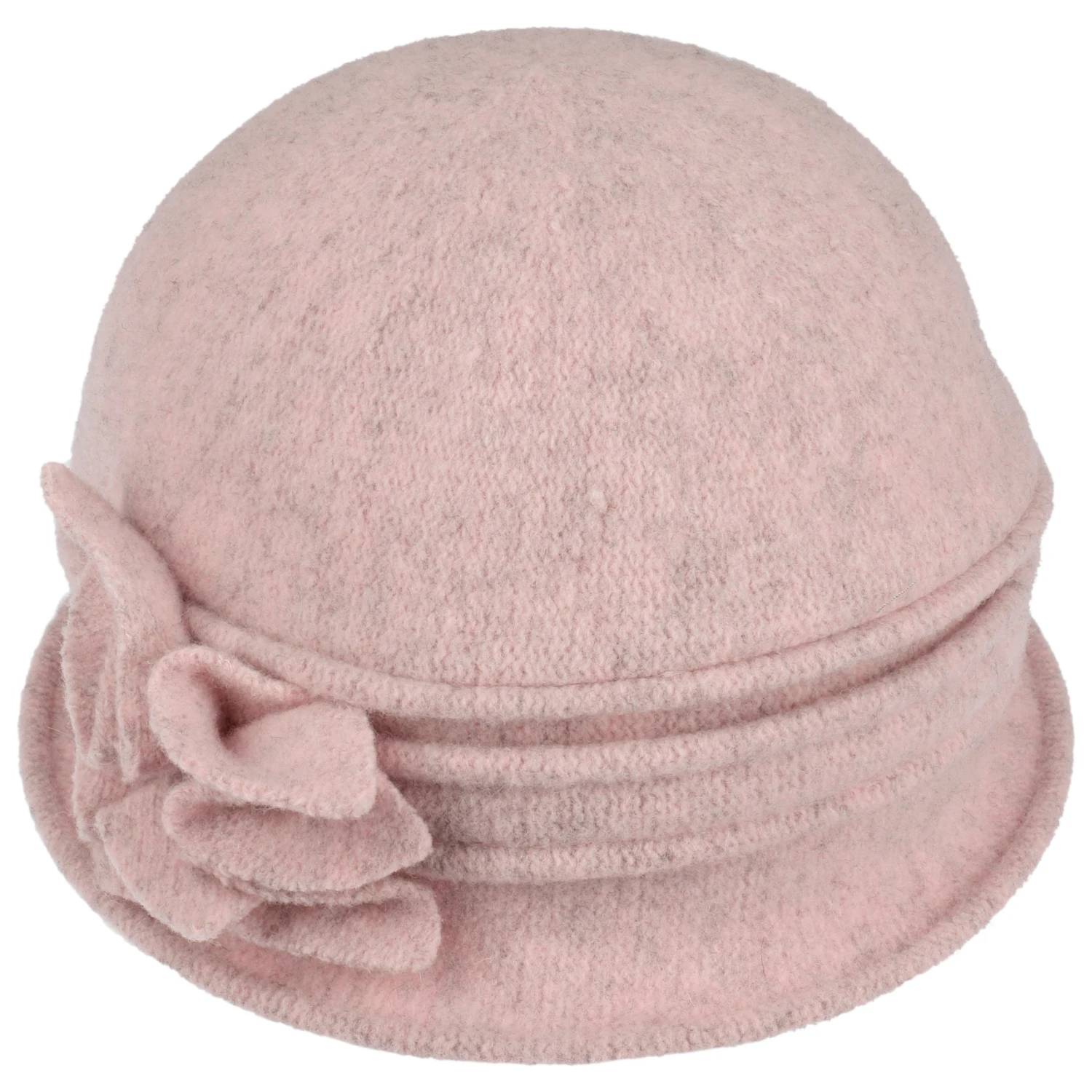 Er präsentiert sich in einer ansprechenden Glockenform. Das breite, in dekorative Falten gelegte Hutband ist mit einer großen Blumenapplikation versehen, die die Blicke auf die stilvolle Kopfbedeckung zieht. Zu femininen Winter-Outfits wie einem Strickkleid und einem Wollmantel passt der Hut hervorragend.
