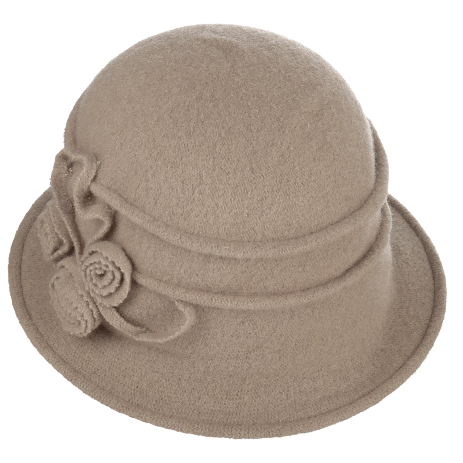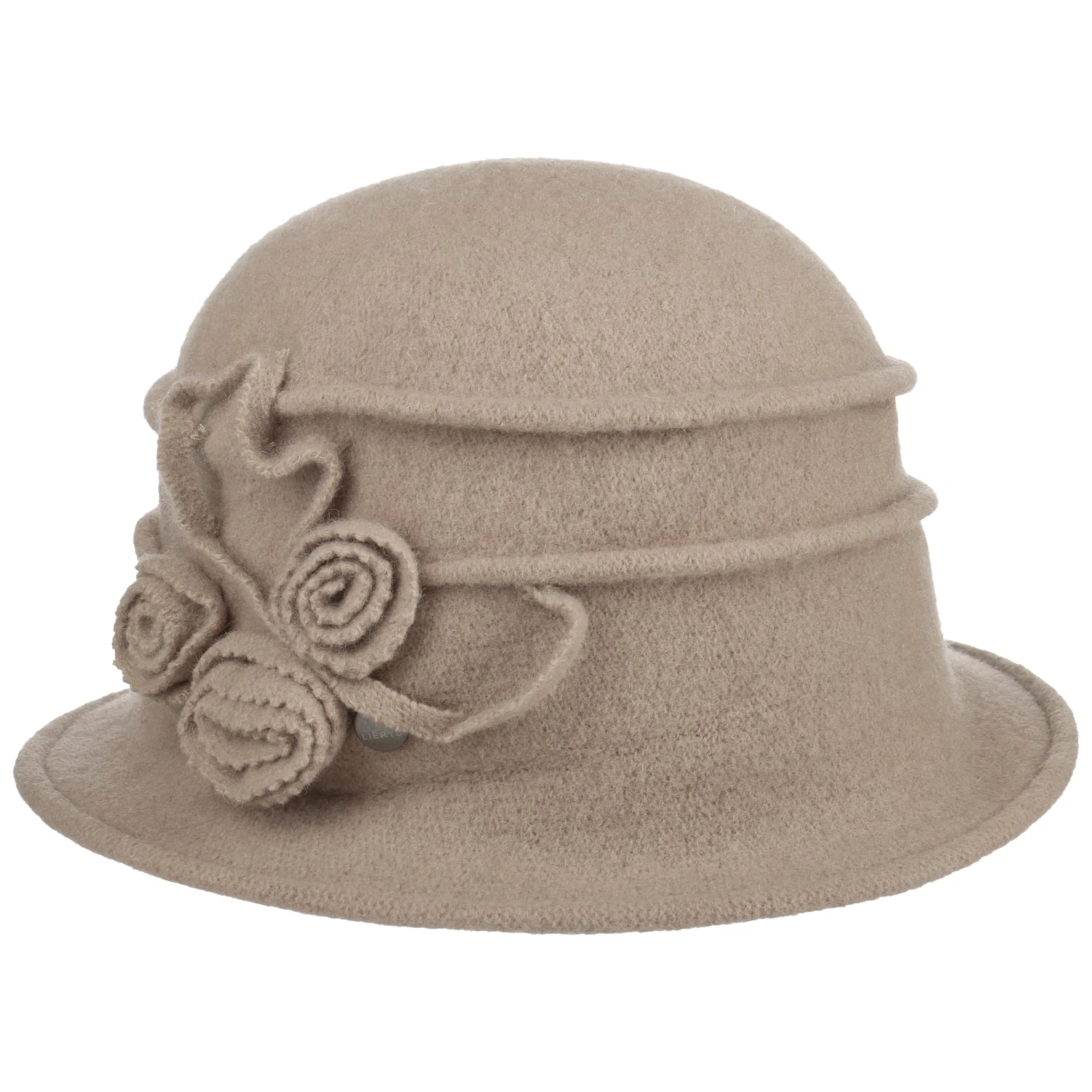 Dekorative Biesen und drei wie Rosen geformte Blüten prägen den bezaubernden Look der stilvollen Kopfbedeckung. Durch die mit Liebe zum Detail gestalteten Zierelemente wird der Hut in Glockenform zum Blickfang jedes Outfits. Die eingefasste Krempe rundet das edle Design ab.