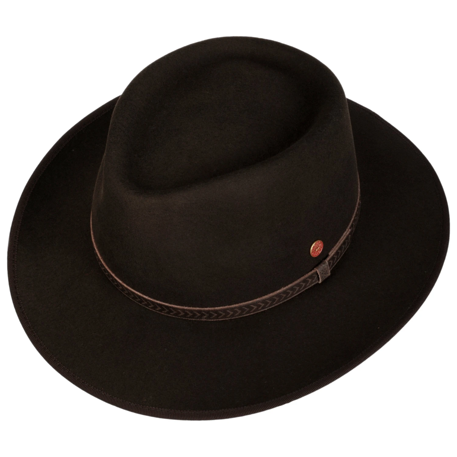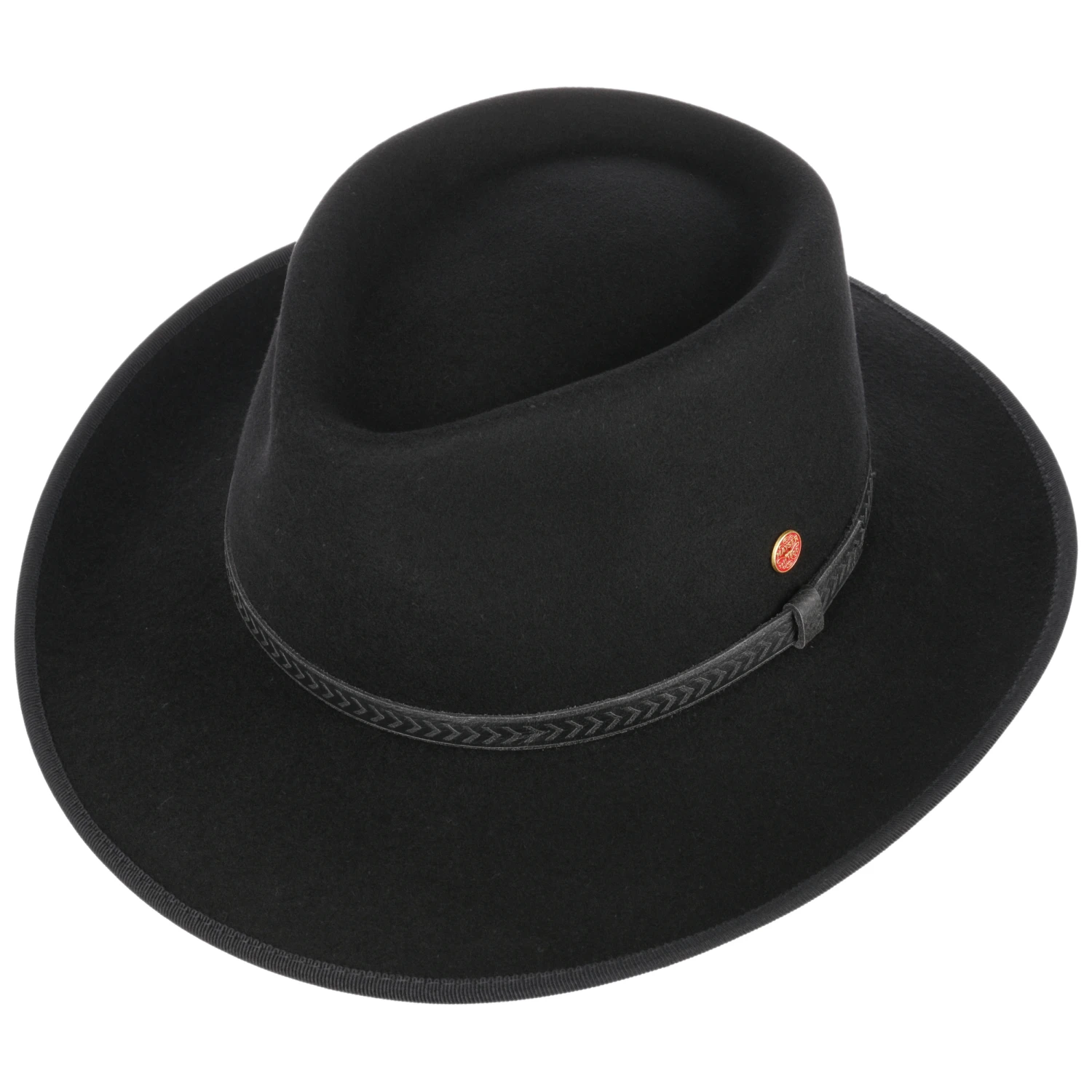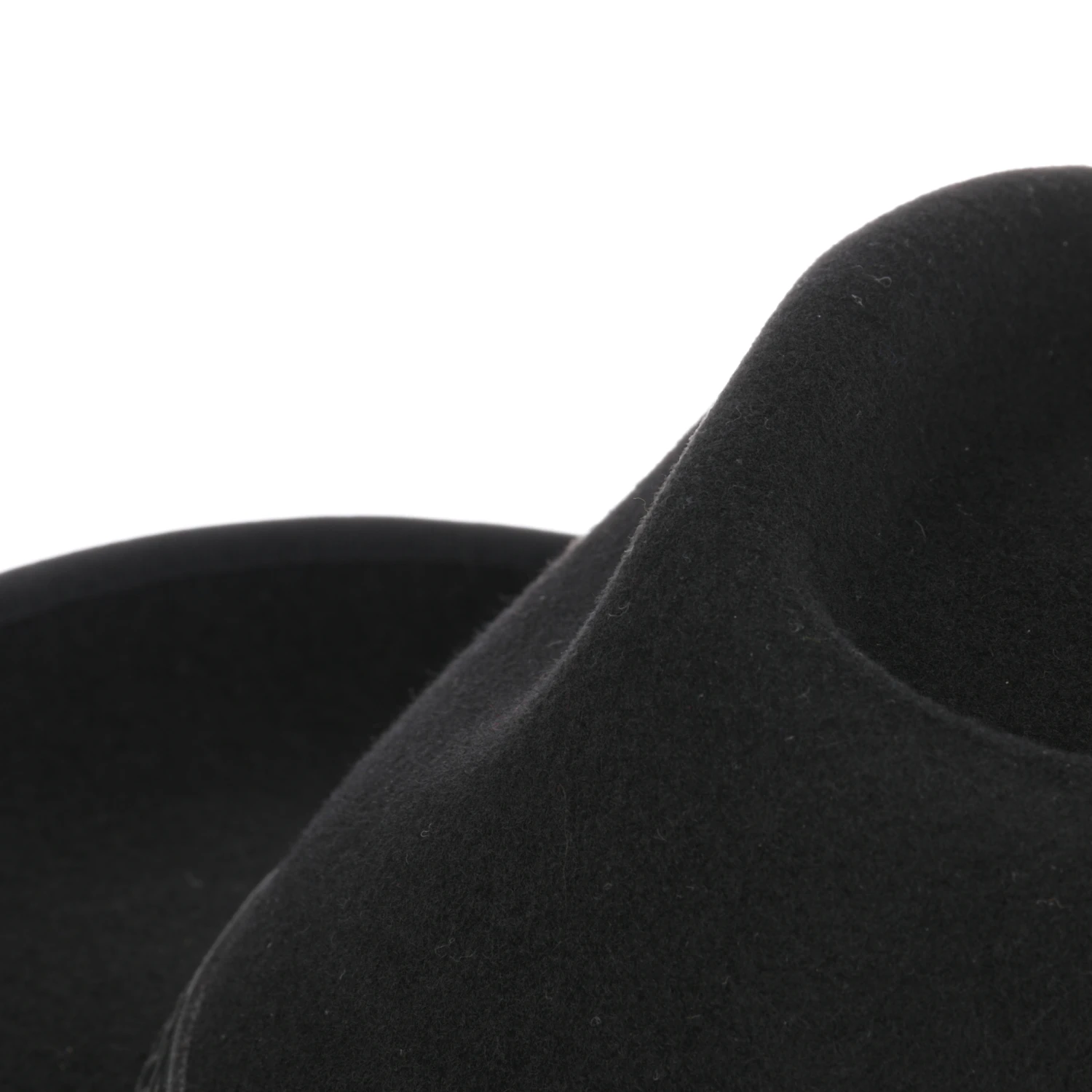 Zu dem unifarbenen Design mit dezent geschwungener Krempe gesellt sich eine schmale Garnitur aus Leder, darüber zeigt der Filzhut seitlich einen Markenpin. An Extras bringt der Westernhut wasserabweisende und knautschbare Eigenschaften mit und ist somit optimal für Wanderungen, Reisen und Unternehmungen im Freien ausgestattet.