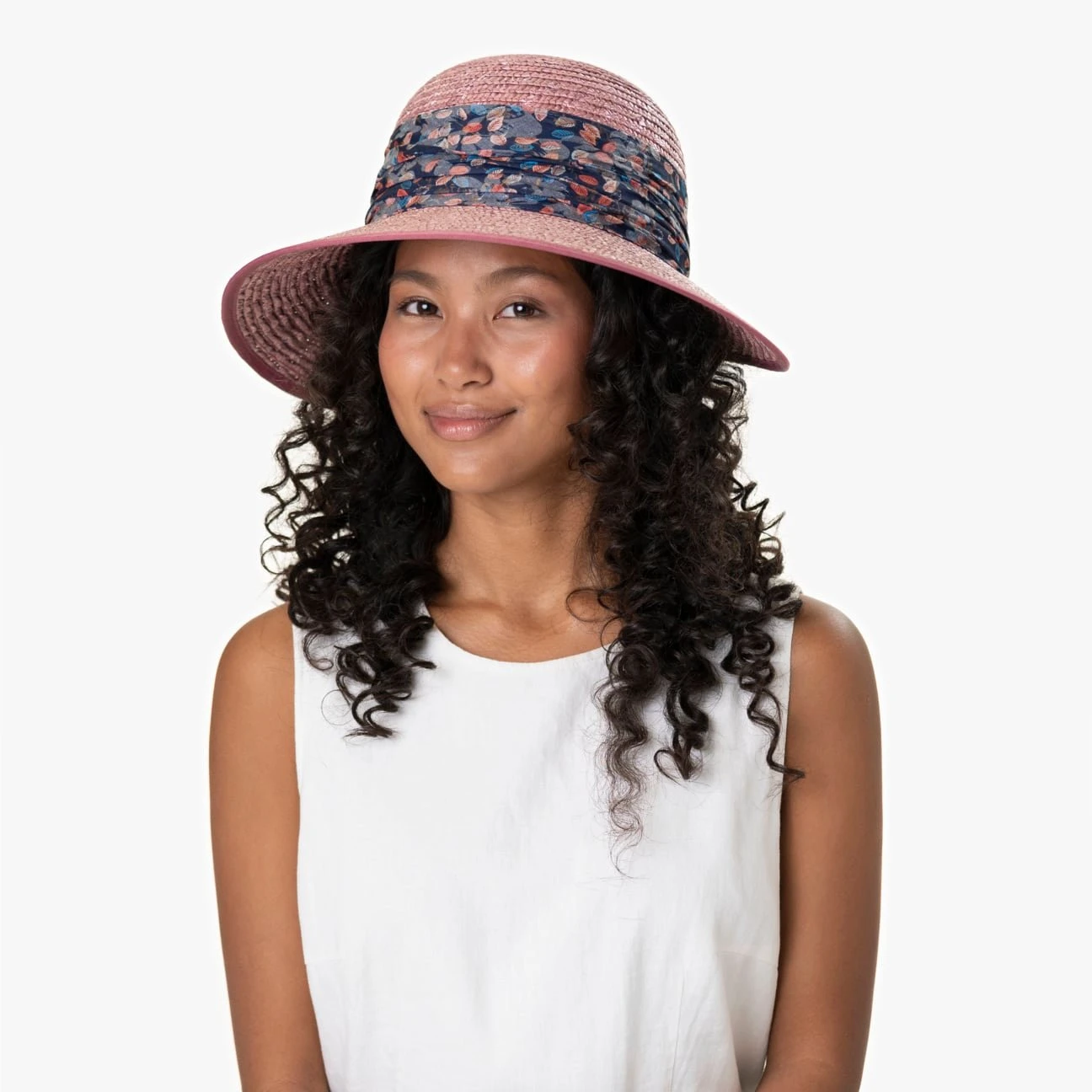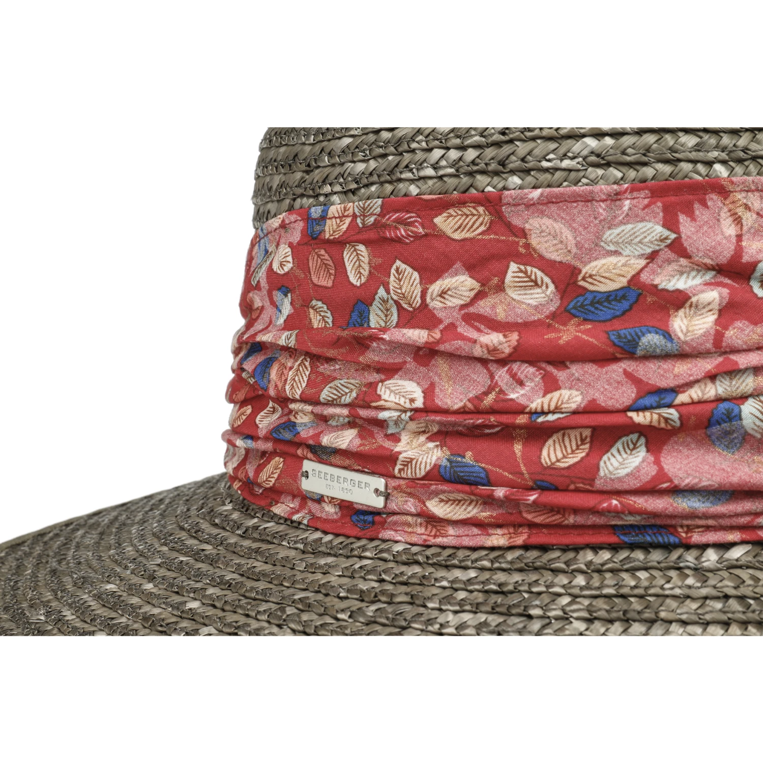Um die Krone herum umgibt sich der Strohhut mit einer breiten, floral gemusterten Stoffgarnitur, was die feminine Ausstrahlung unterstreicht und den Sommerhut zum Blickfang macht.