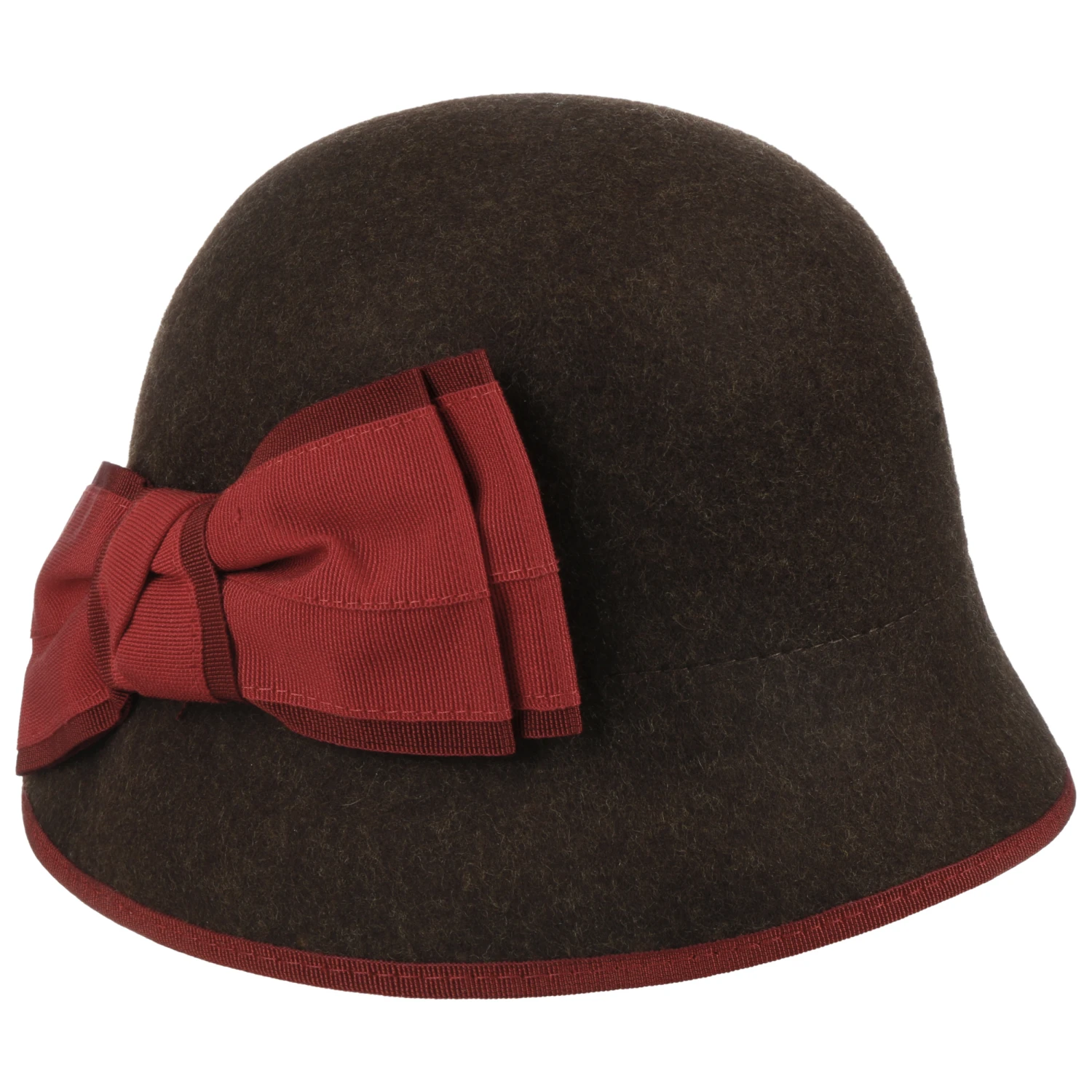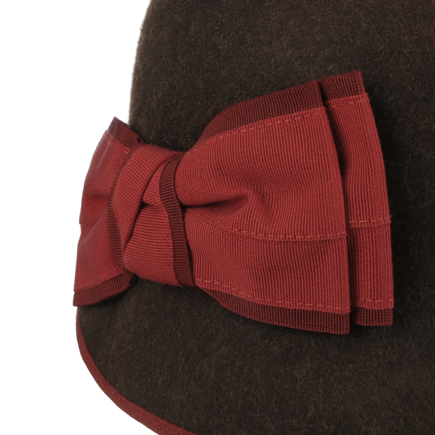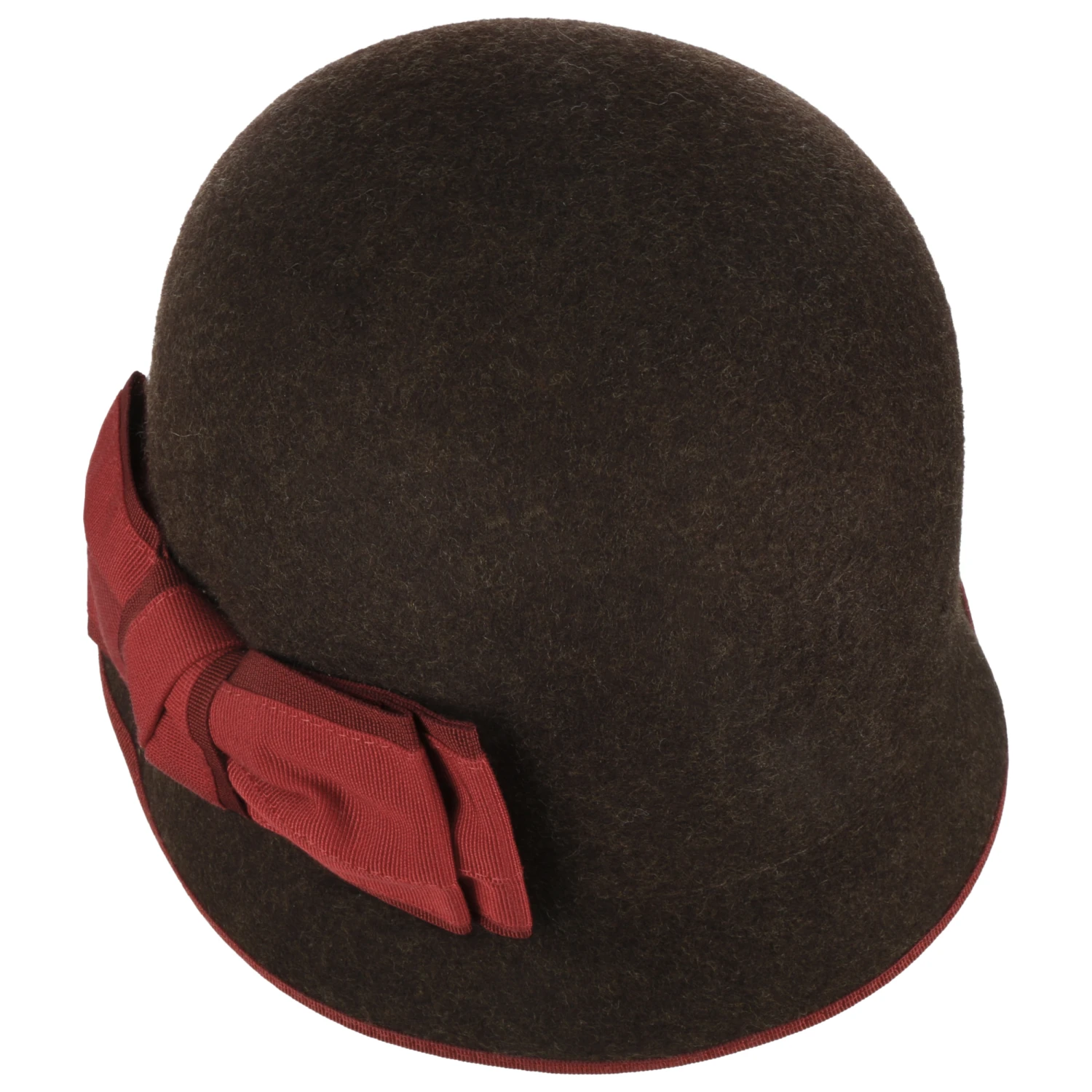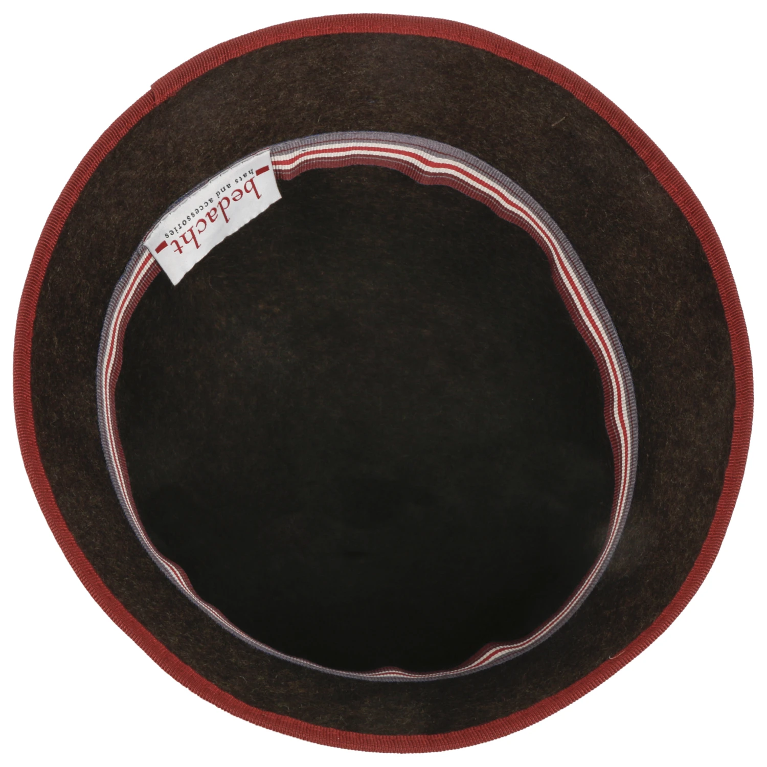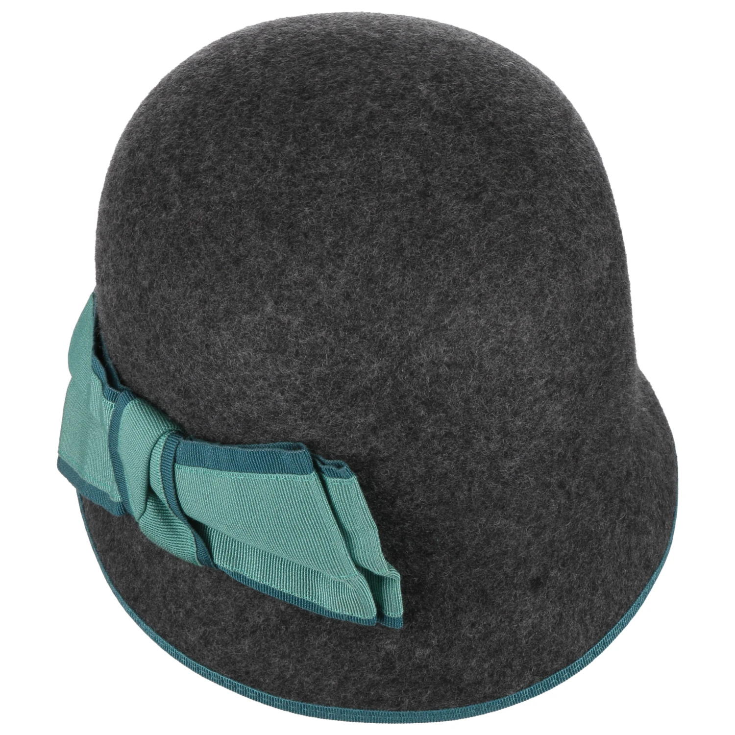 Zu dem unifarben melierten Design des handgefertigten femininen Filzhuts gesellt sich eine kontrastfarbene Schleife aus Ripsband, apart seitlich sitzend und mit harmonisch abgesetzten Rändern, passend zur Einfassung um die Krempe. Seiner Dame steht der Winterhut kleidsam zu Gesicht und das Outfit erfährt eine stilvolle Ergänzung.