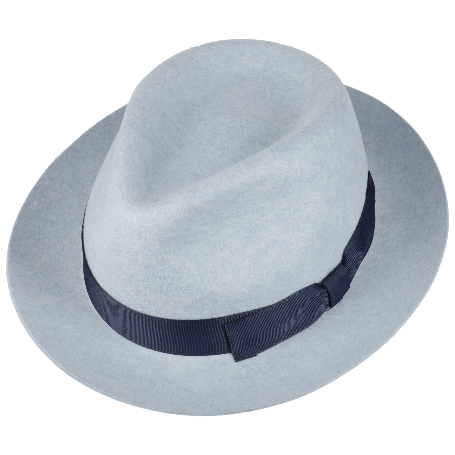 Geschmeidiger Wollfilz formt sich zu dem Fedora mit trendig eingedellter Krone und kontrastfarbener Ripsbandgarnitur mit asymmetrischer Schleife. Ein ideal kombinierbares optisches Highlight mit geschmackvollem Charme, das Ihr und Ihm gut zu Gesicht steht.