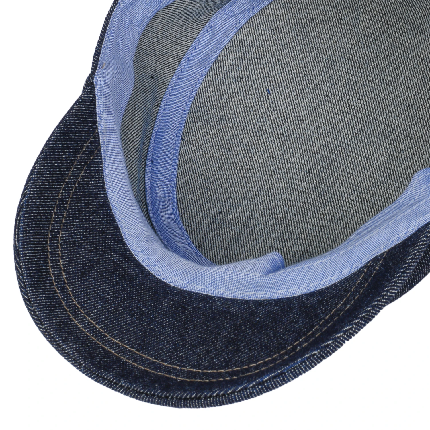 Dunkelblauer Jeans-Stoff im Arbeiterstil ist hier zu einer schnittigen Cap im Military-Style verarbeitet worden.