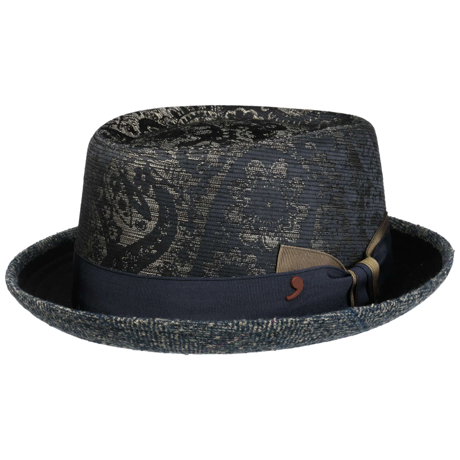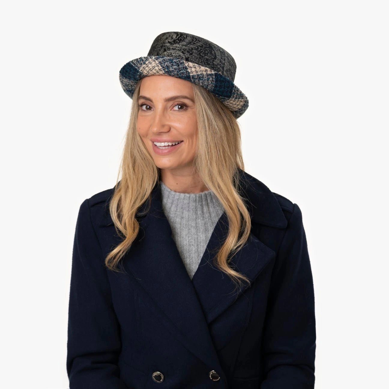 Die typische, flache Hutkrone mit Tellerbeule ziert ein elegantes Paisleymuster. Dazu bildet das Karomuster vom aufgebogenen Rand der schmalen Krempe einen dynamischen Kontrast. Das einfarbige Ripsband mit zweifarbiger Schleife rundet das exquisite Design elegant ab. Für höchsten Tragekomfort sorgt ein Baumwollfutter.