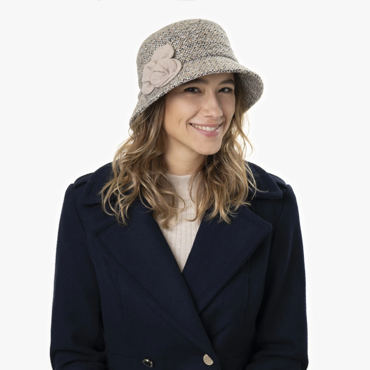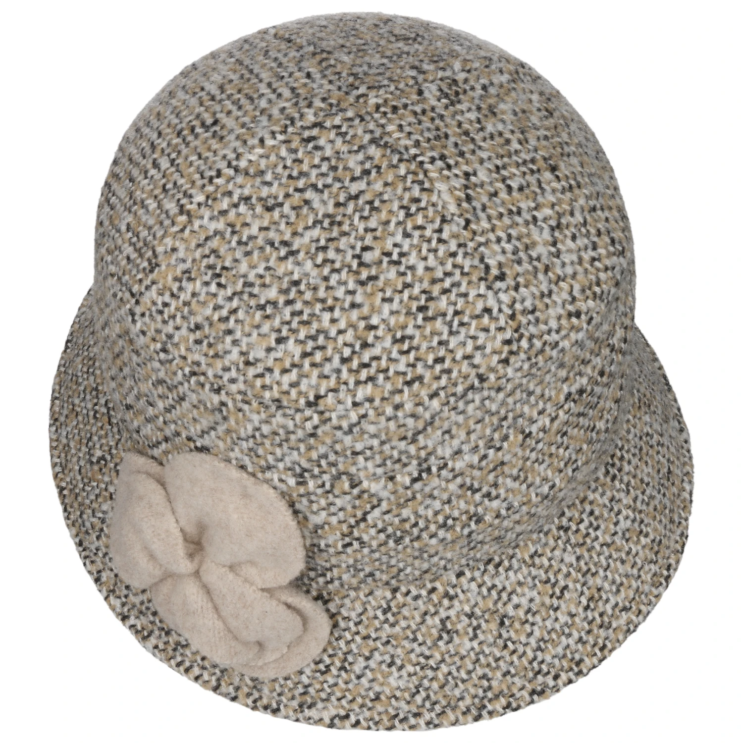 Ebenso warm wie atmungsaktiv schmiegt er sich aufs Haupt und beeindruckt dabei mit seinem mehrfarbig melierten Allover-Muster. Seine feminine Ausstrahlung verdankt der Tweedhut der seitlich angebrachten Blütenapplikation aus 100% Schurwolle.