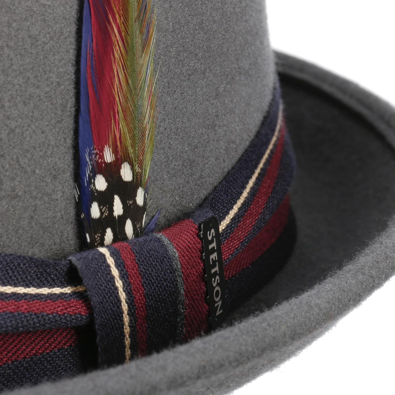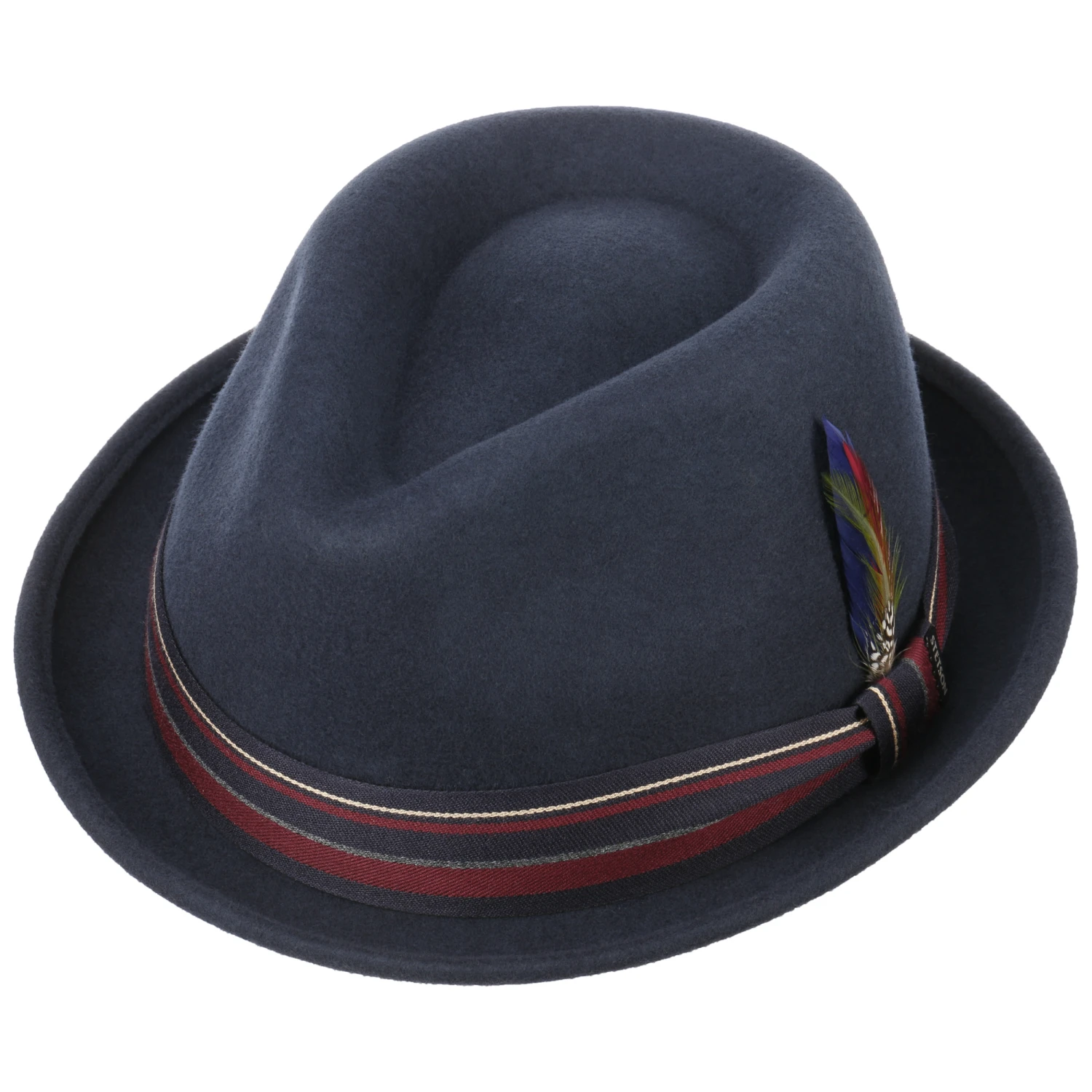 Ein mehrfarbig gestreiftes Hutband und eine kecke Feder verleihen ihm eine verspielte und dennoch elegante Ausstrahlung. Kühler und feuchter Witterung setzt der Fedora wärmenden, wasser- und ölabweisenden Wollfilz in Asahi-Guard®-Qualität entgegen.