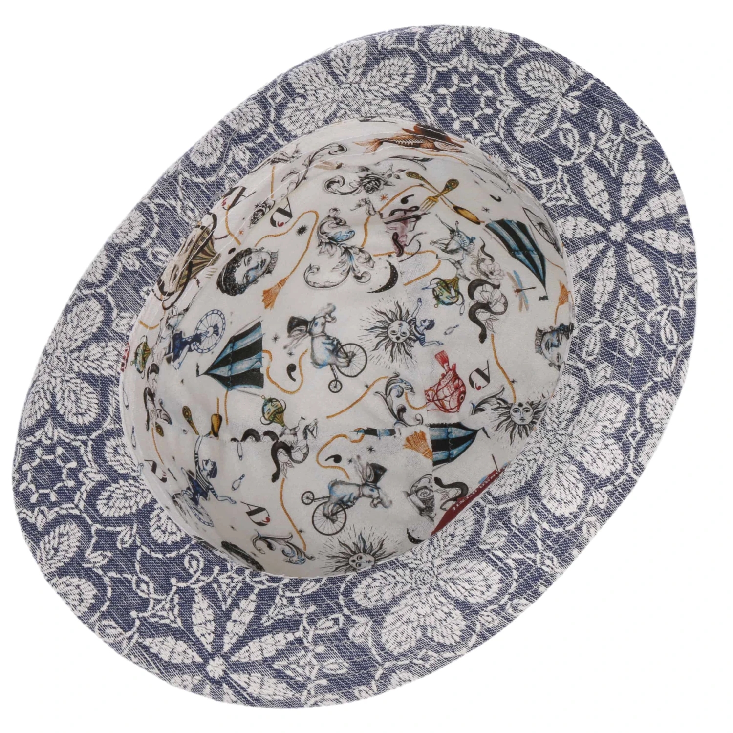 Auf der Materialmischung mit großzügigem Anteil Baumwolle tummelt sich ein stilvolles Blütenmuster, was die Melone von Alfonso D´Este gemeinsam mit der Ripsbandgarnitur zu einer auffallend schönen Kopfbedeckung macht.