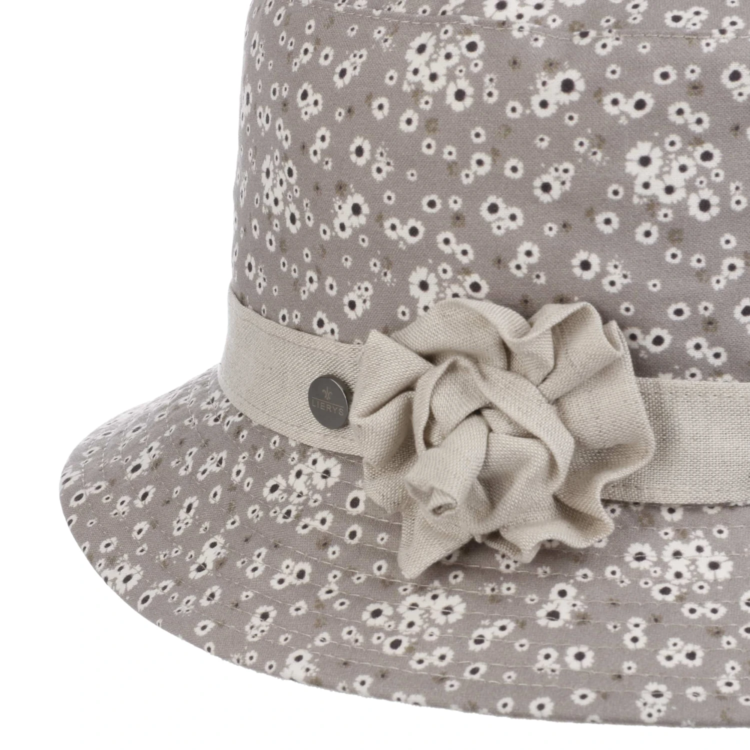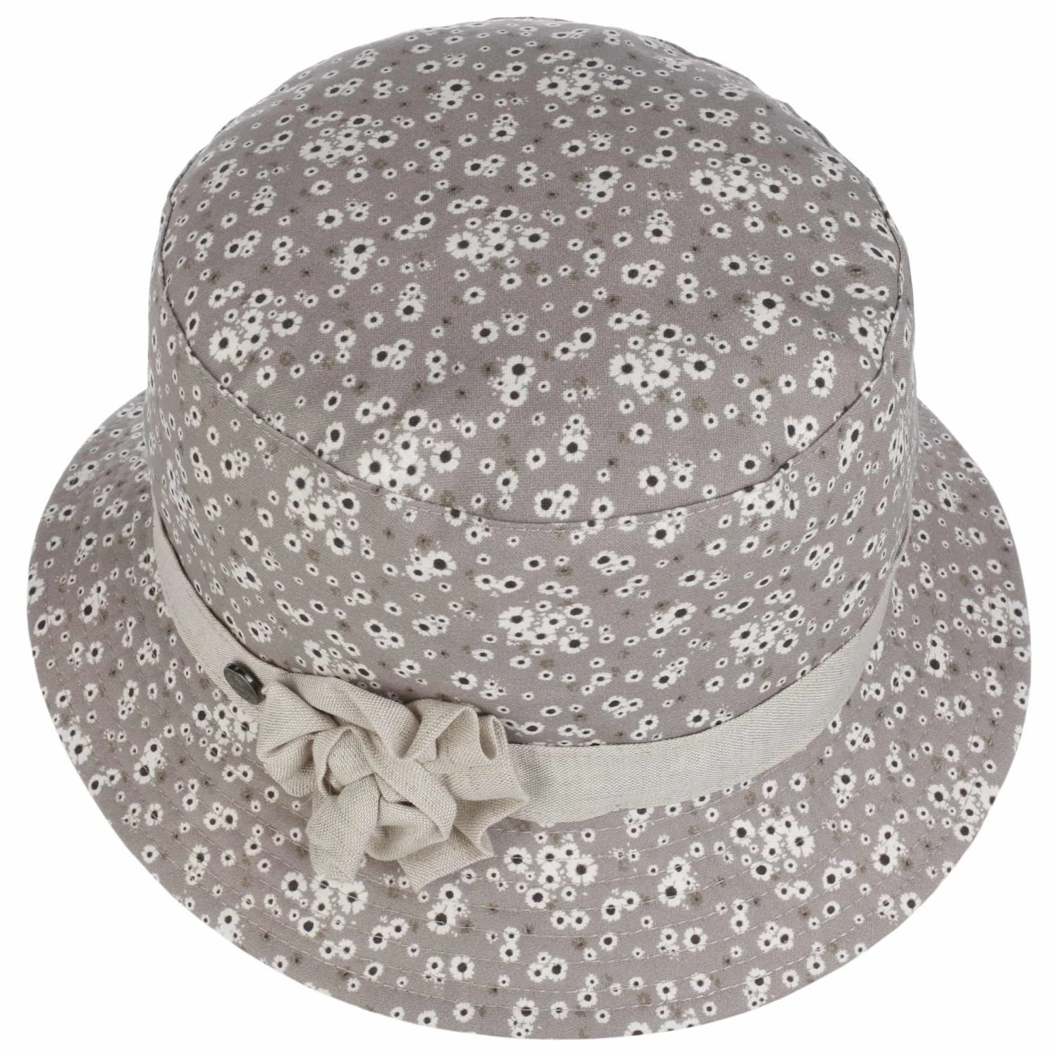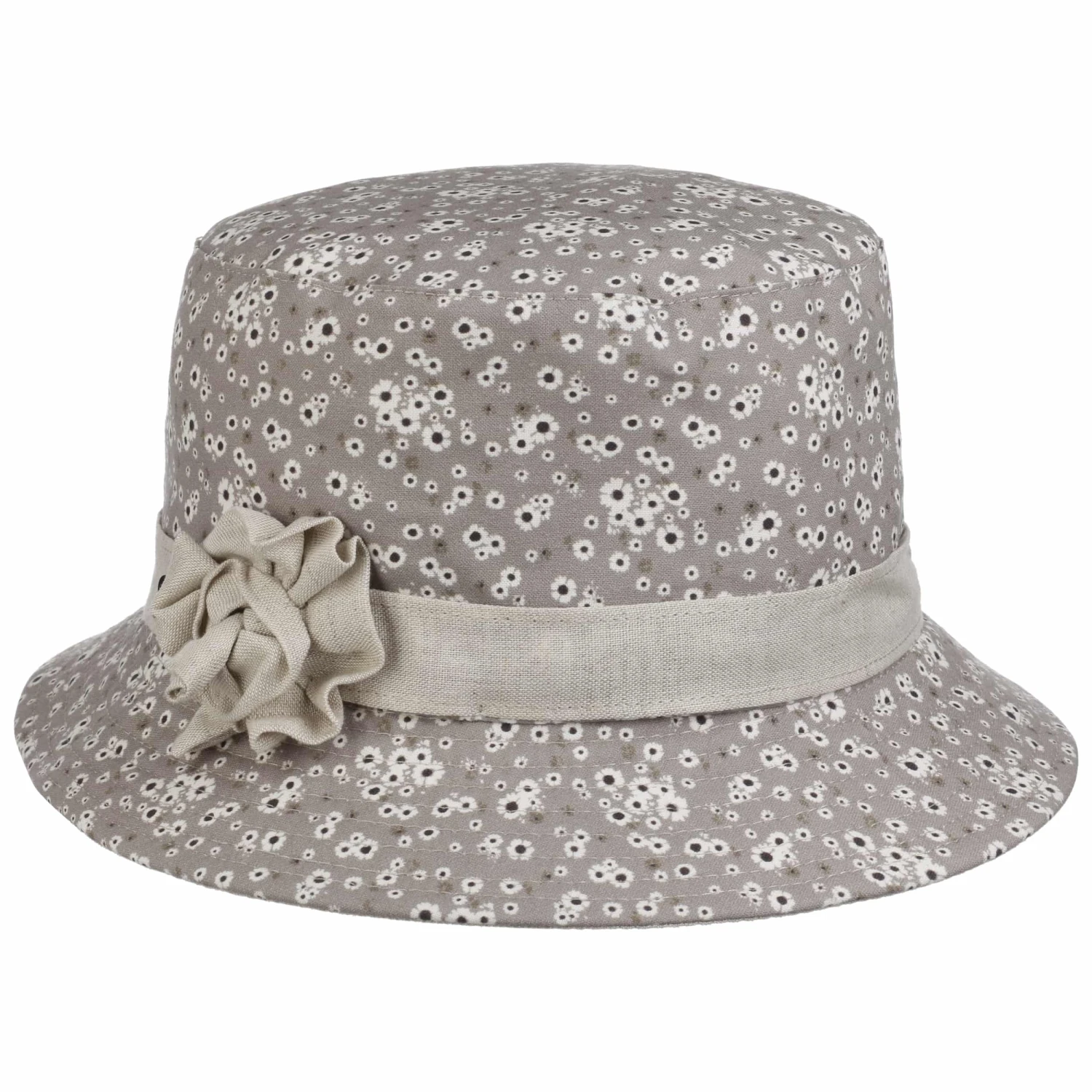 Ein schönes lebhaftes Muster aus kleinen Blüten ziert den Hut vom flachen Kronendach bis über die nach unten geneigte Krempe. Dazu gesellt sich eine üppige Blumen-Applikation, die auf dem farblich abgestimmten Ripsband platziert ist.