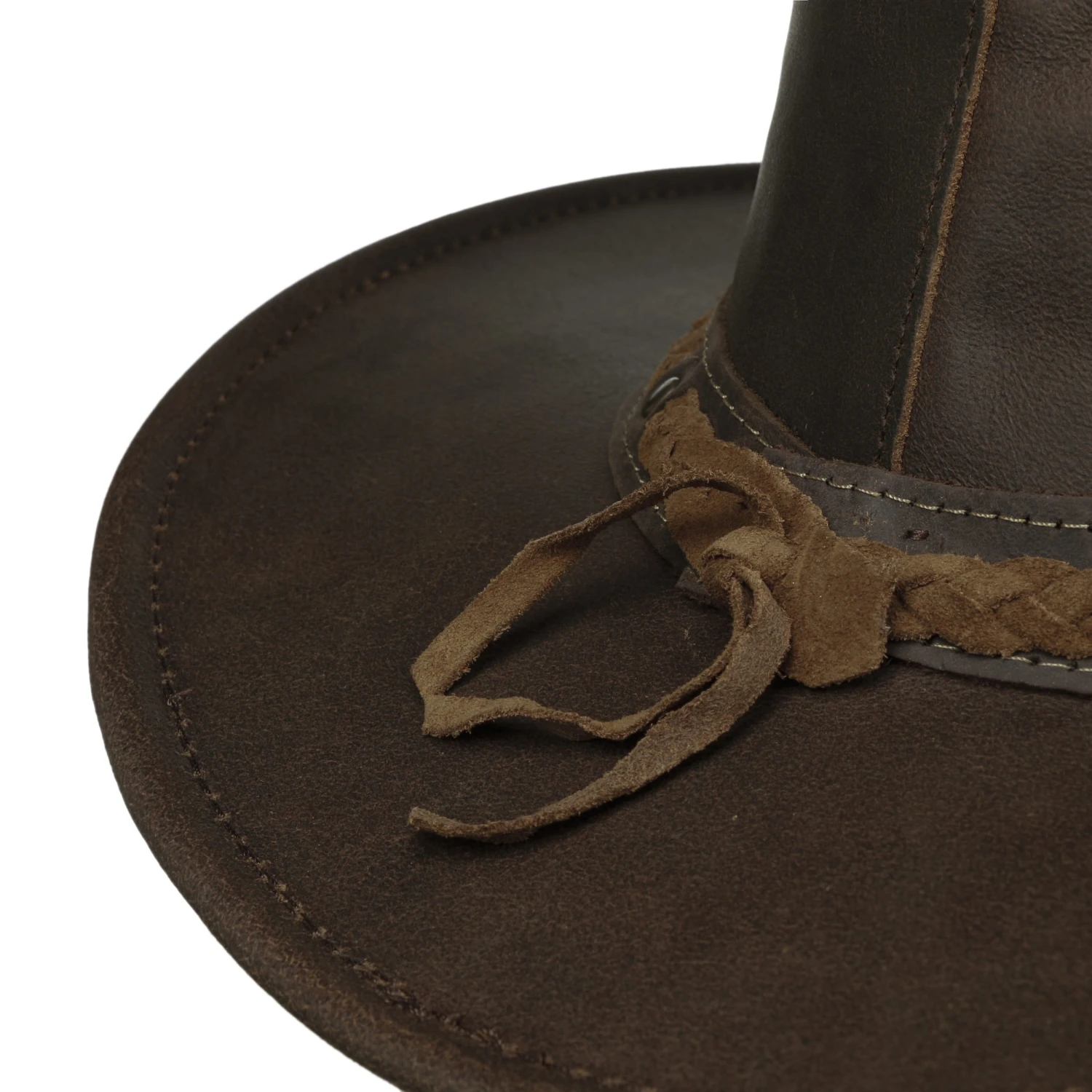 Die typische Form eines Westerns und das Material aus 100% Leder prägen den authentischen Charakter, der den Reiz der strapazierfähigen Kopfbedeckung ausmacht. Viele Details wie ein Kinnband, Belüftungsösen und ein teilweise geflochtenes Garniturband machen den Hut zum anregenden Blickfang.